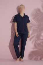 ست پیژامه زنانه مدل دکمهدار، با آستین کوتاه و حاشیهدار، رنگ سرمهای و از جنس پنبه – 6040