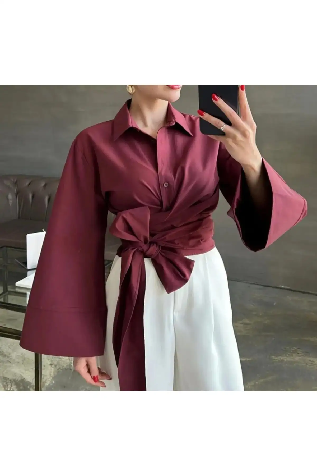 بلوز زنانه آستین دار قرمز شرابی با گیره کمربند و یقه گرد – 9885
