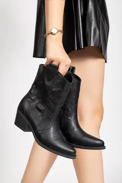 بوت کوتاه وسترن زنانه از چرم مصنوعی مشکی با گلدوزی مشکی – 12852