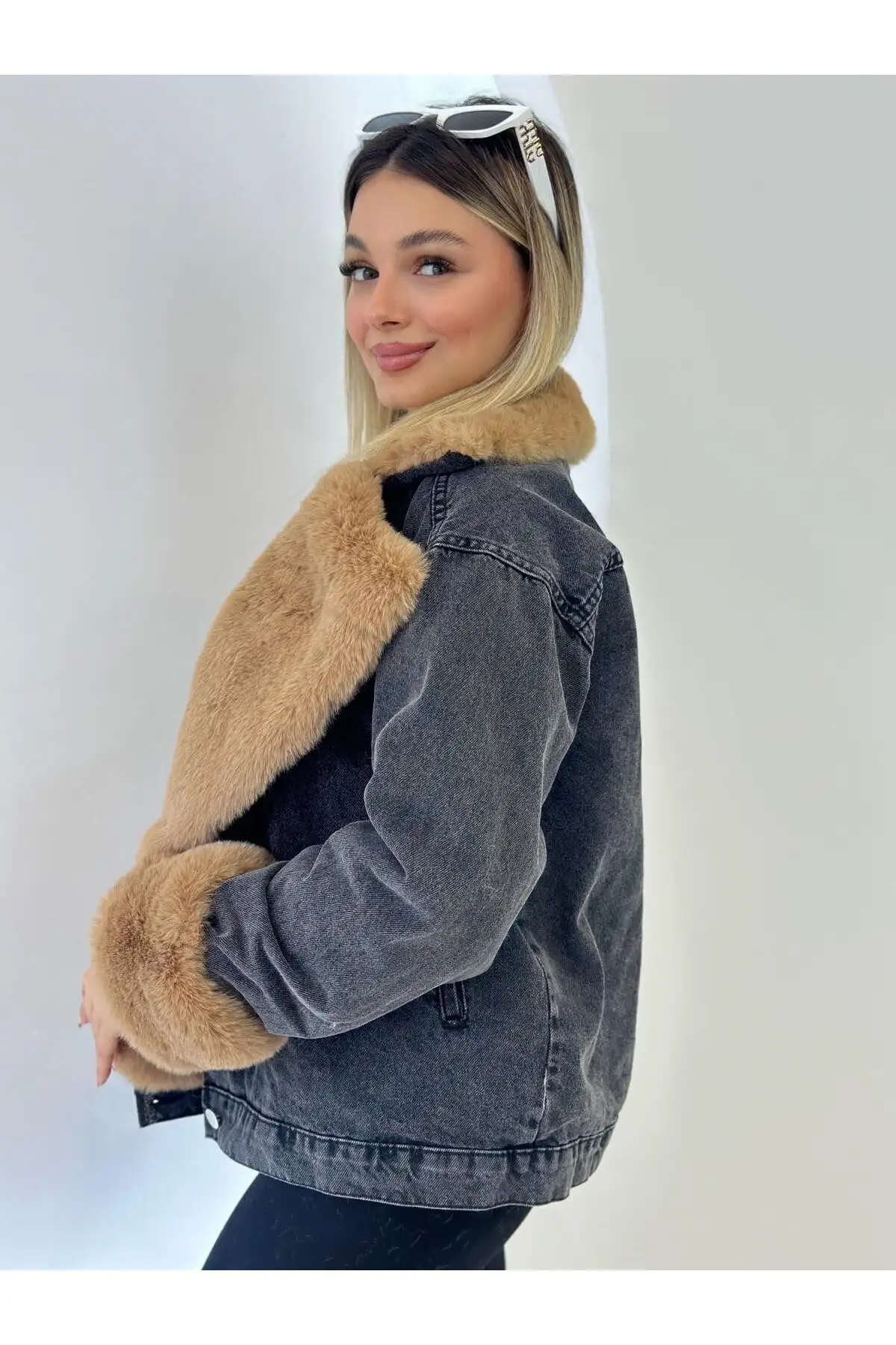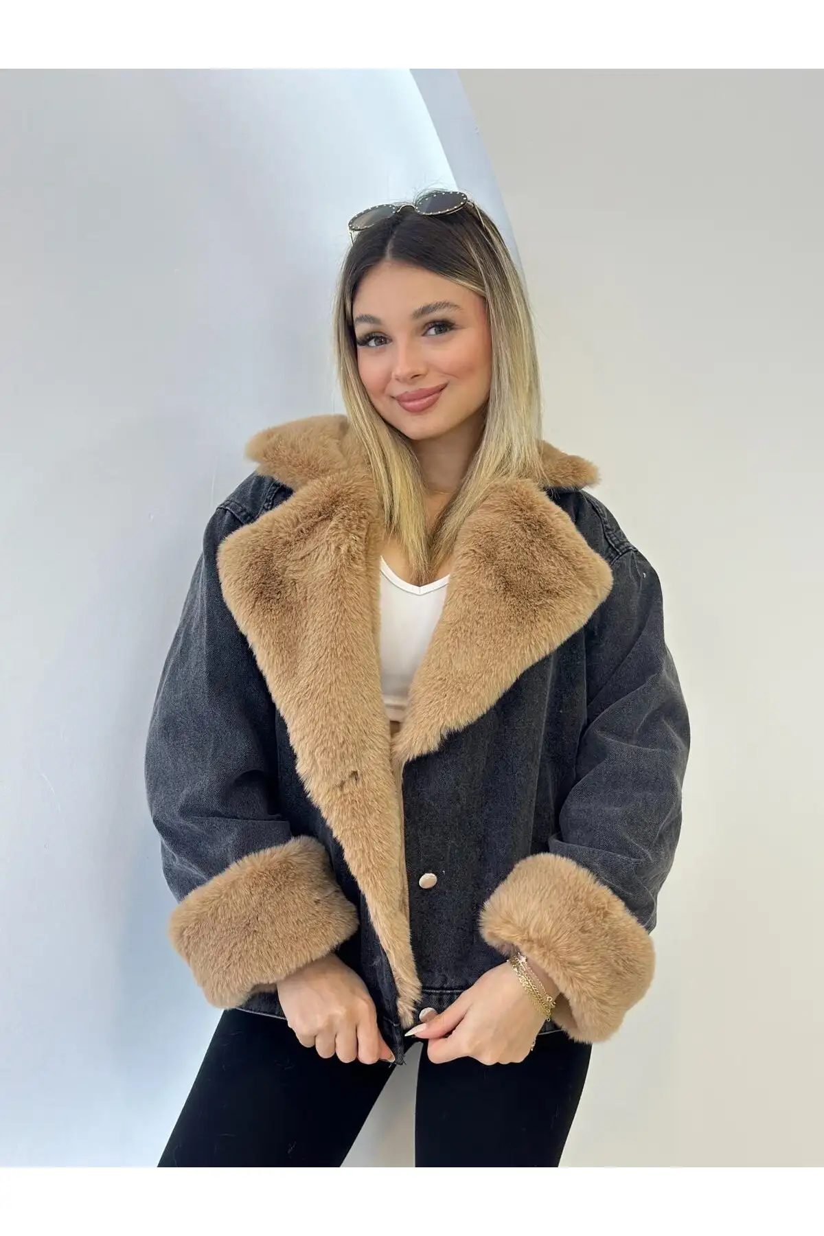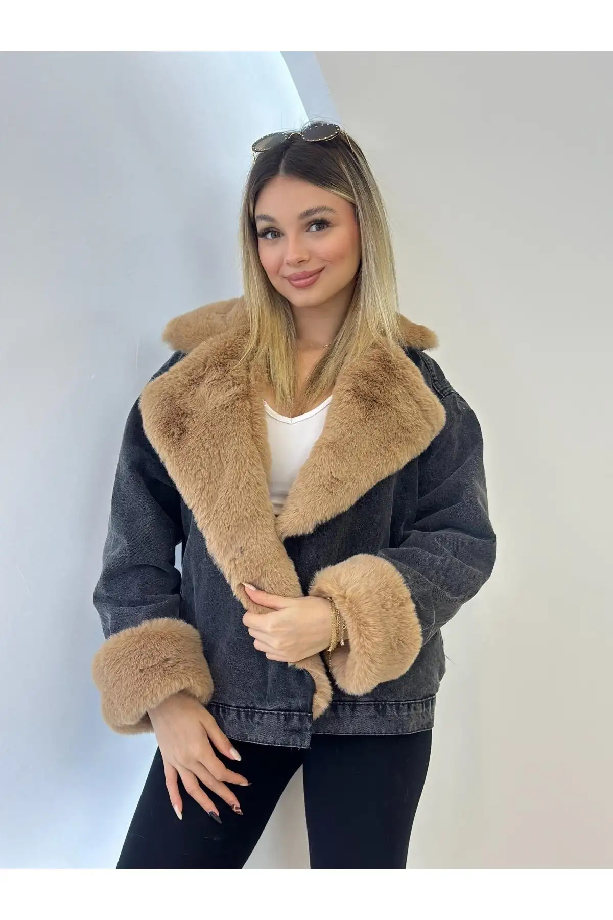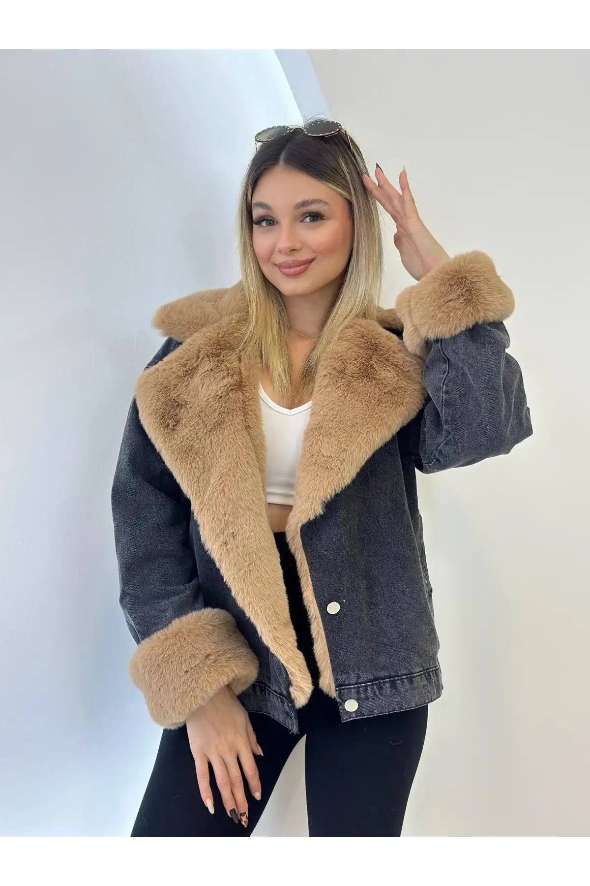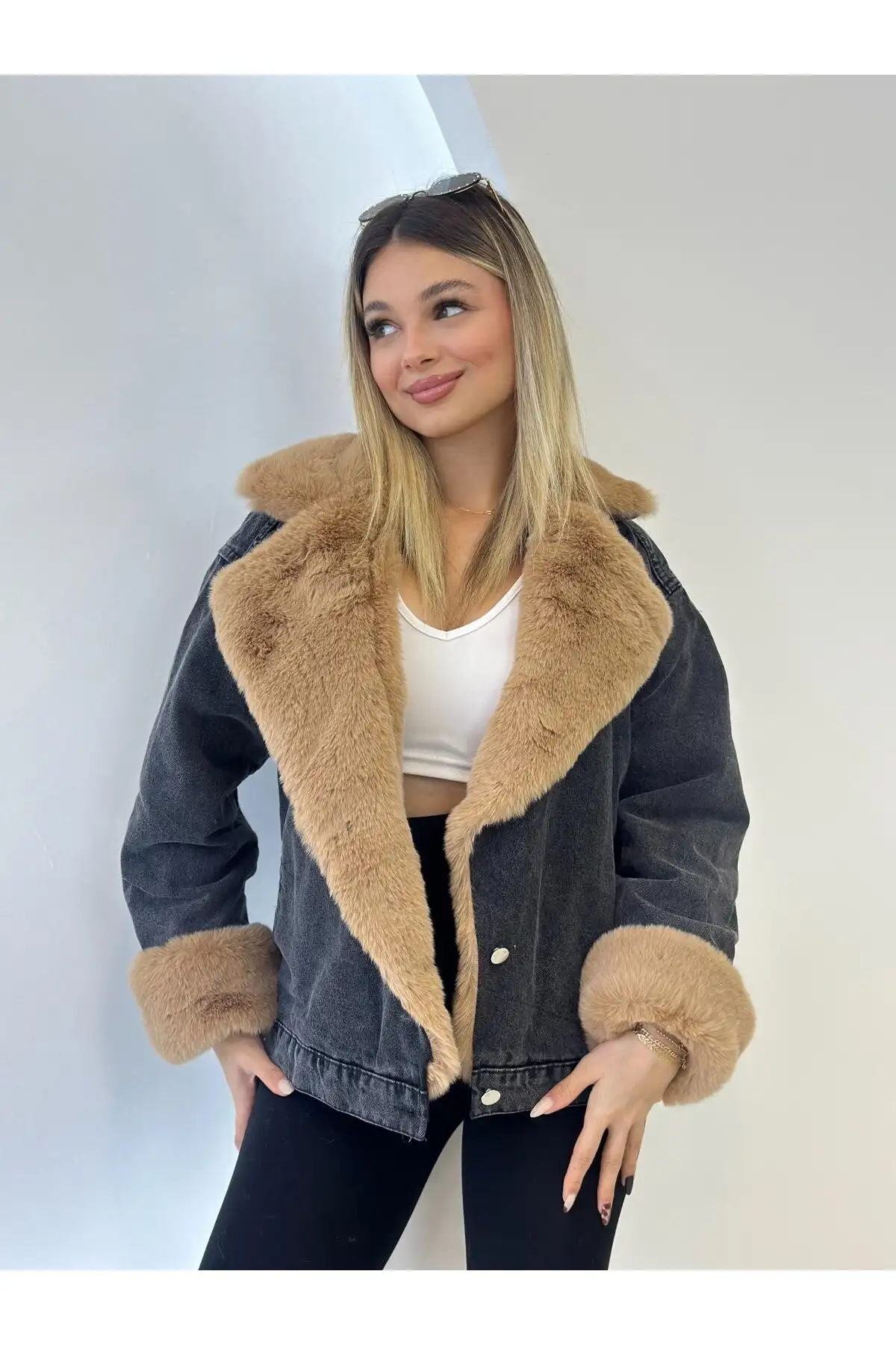 ترنج کت زنانه جین با خز سفید ترک