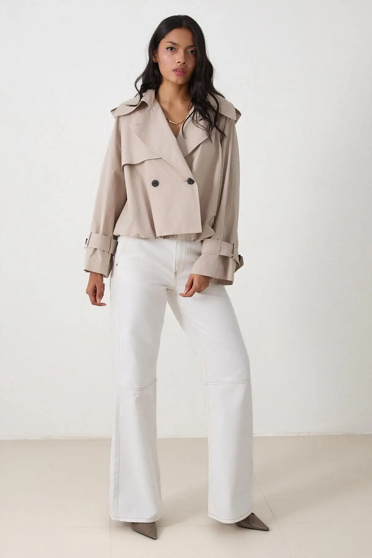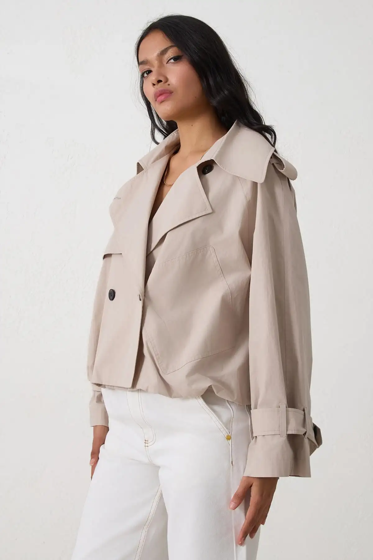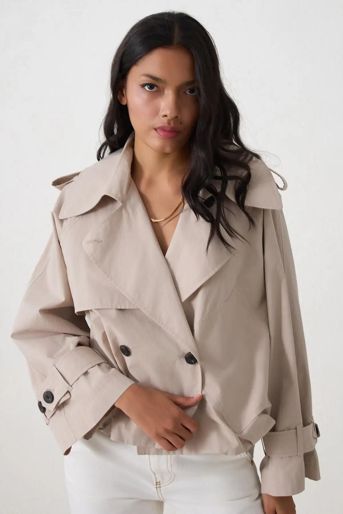 ترنچکت کوتاه با دکمه نامتقارن و یقه بژ از پنبه