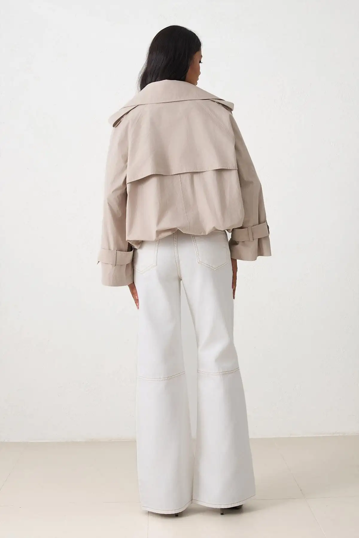 ترنچکت کوتاه با دکمه نامتقارن و یقه بژ از پنبه – 10541