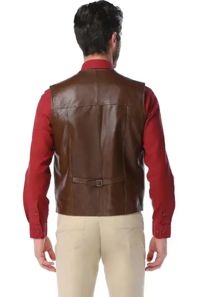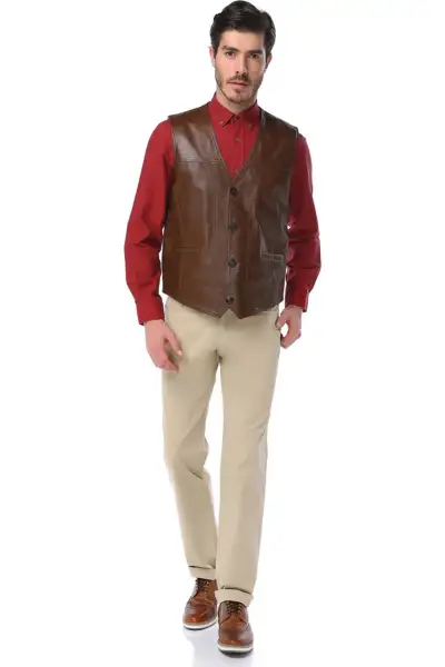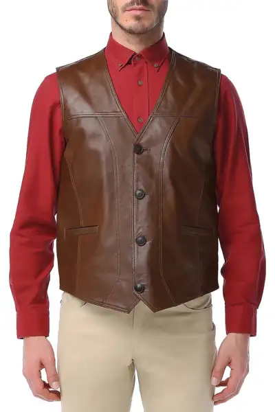 جلیقه چرم اصلی مردانه کلاسیک با دکمه رنگ شتری آنتیک – 12710
