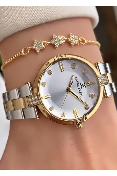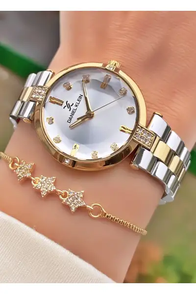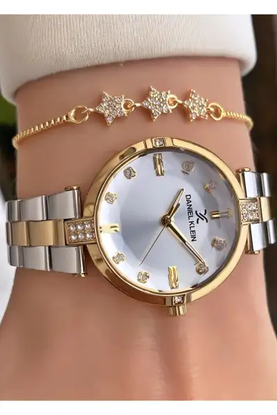 ساعت زنانه شیشه کریستالی ضمانت2 ساله به همراه دستبند هدیه با طراحی خاص و جذاب که مناسب برای هر مناسبتی است. این ساعت با رنگ نقرهای و طلایی، زیبایی خاصی را به دست شما میبخشد.این محصول از برند Daniel Klein ارائه شده است و با استفاده از مواد با کیفیت ساخته شده است. شیشه این ساعت از جنس کریستالی و با دوام است که از خراشیدگی و آسیب جلوگیری میکند.