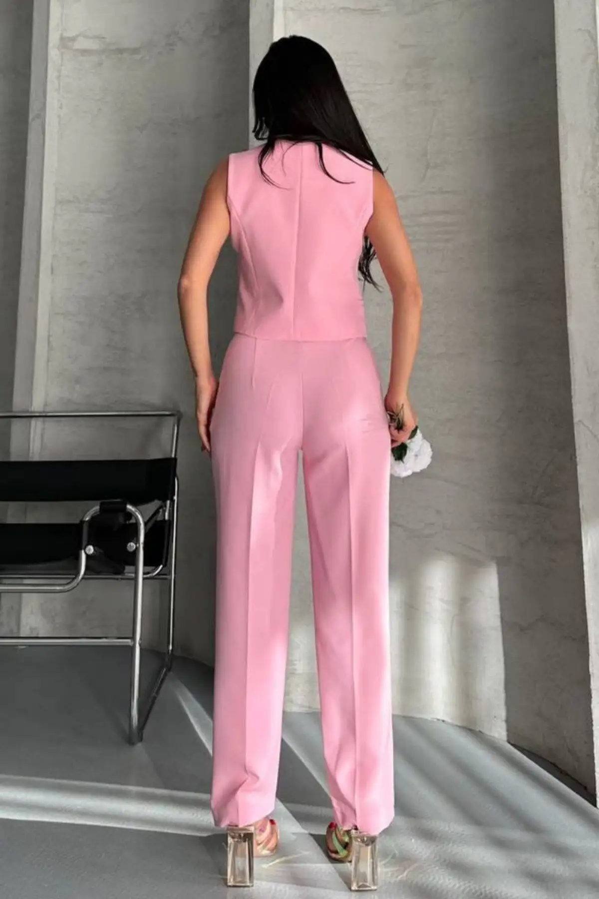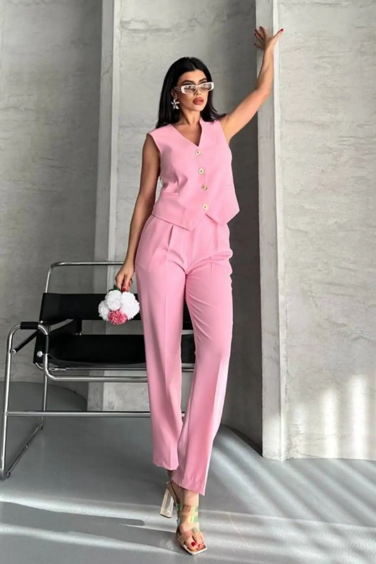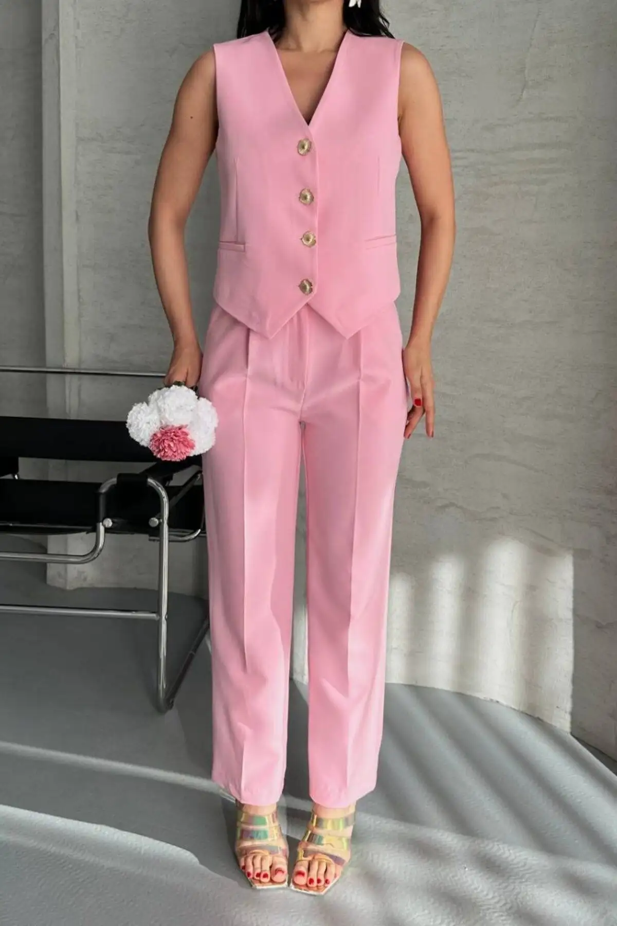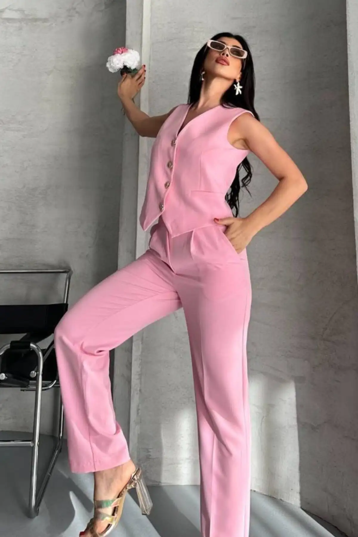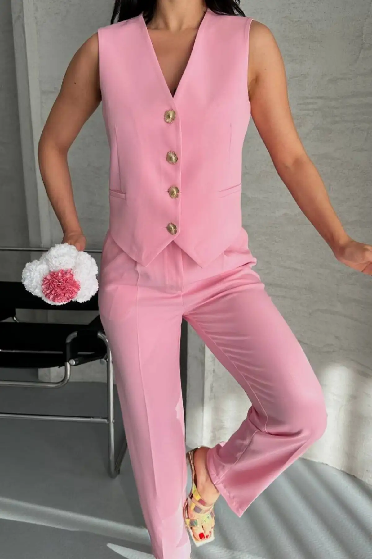 ست بالاپوش و پایینپوش زنانه با جزئیات دکمه طلایی و یقه V شکل – 9860