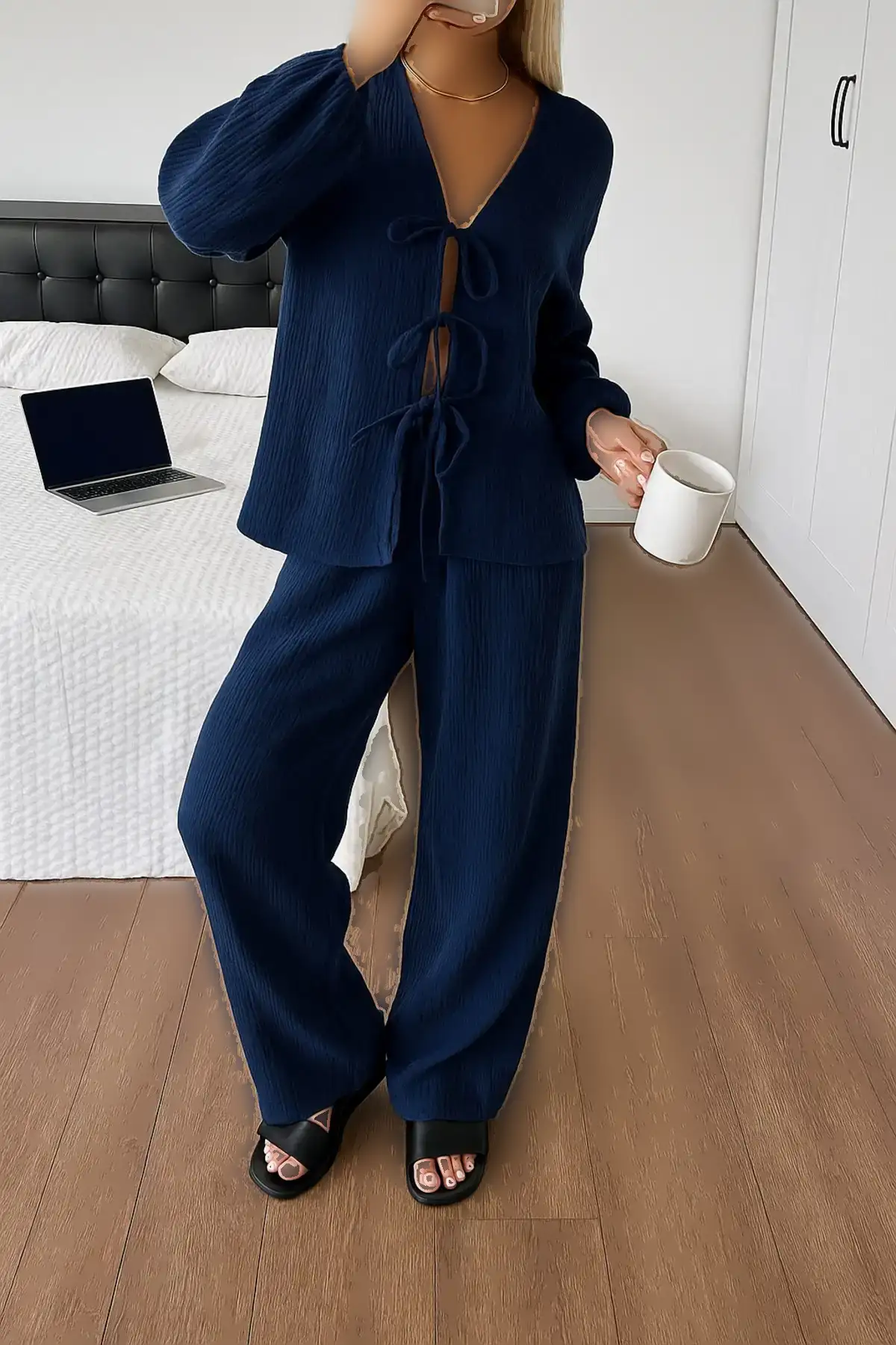 این ست لباس شامل یک پیراهن آبی تیره با دکمههای جلویی و شلوار راسته است که زیبایی و راحتی را همزمان ارائه میدهد.پیراهن با بافتی نرم و لطیف طراحی شده است که بر روی بدن به خوبی نشسته و هر نوع استایلی را میسازد.