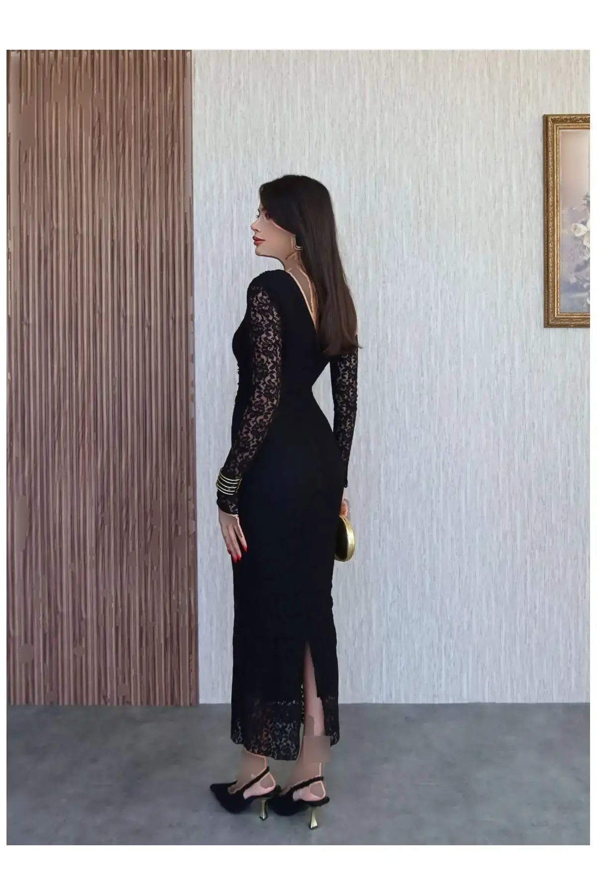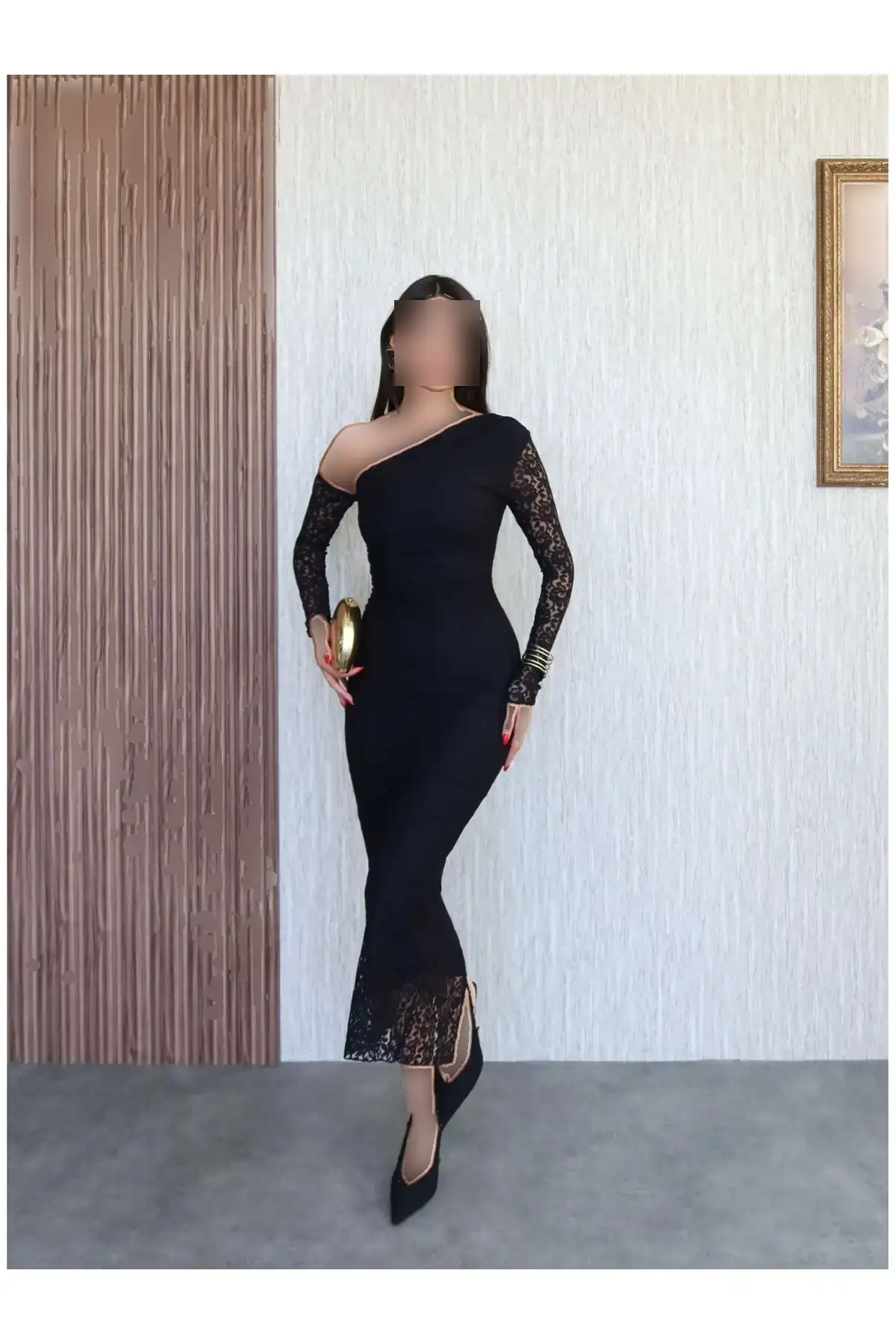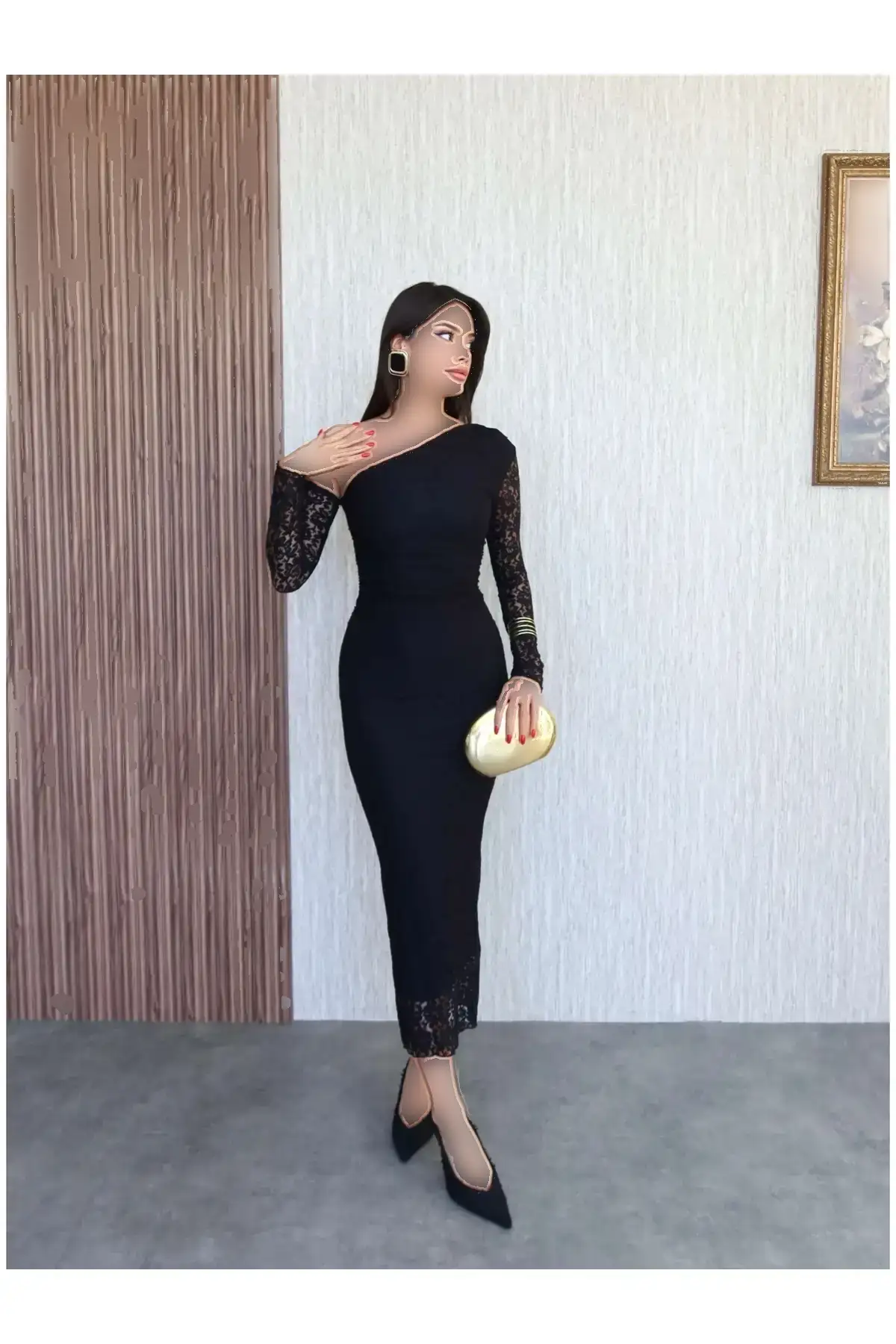 رنگ مشکی لباس باعث میشود که شما بتوانید به راحتی آن را با اکسسوریهای مختلف ست کنید و به ظاهری دلپذیر دست یابید. به علاوه، جزئیات گیپور دار این لباس، علاوه بر زیبایی، حس زنانگی و elegance را به نمایش میگذارد.