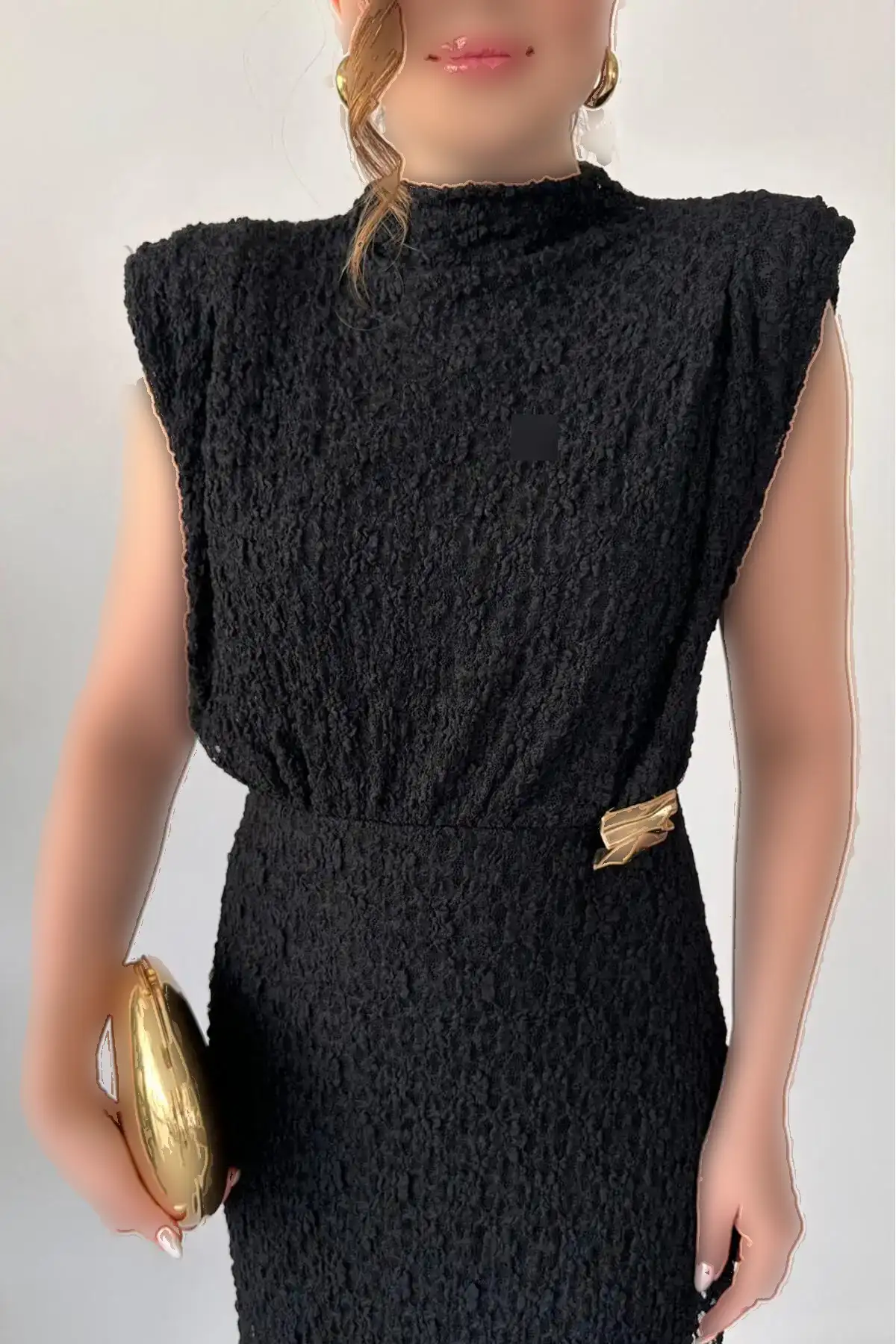 لباس توری مشکی بدون آستین بوده و برای فصل‌های گرم بسیار مناسب است. این نوع طراحی به شما اجازه می‌دهد تا به راحتی از آن در مهمانی‌ها و مراسمات مختلف استفاده کنید.