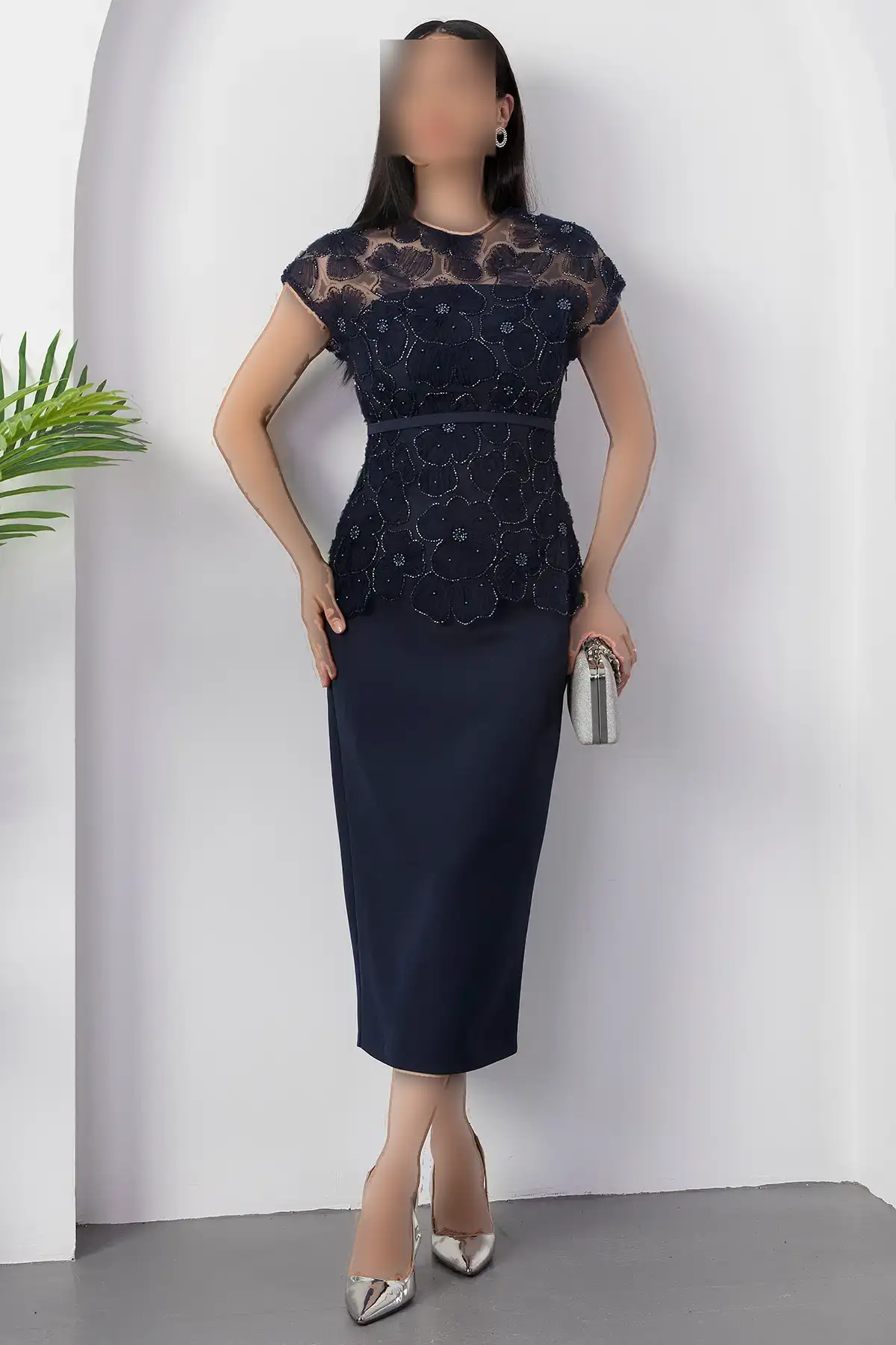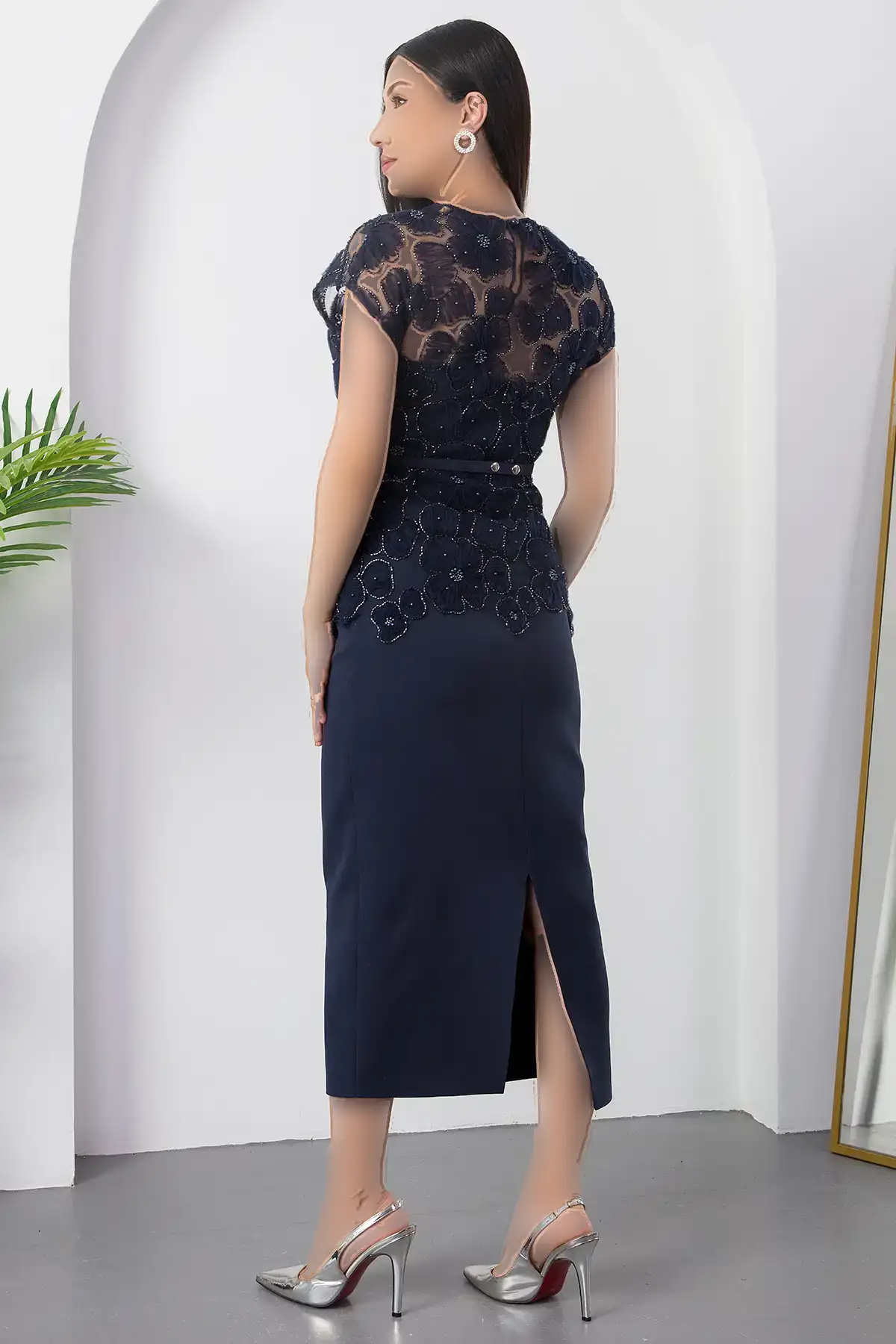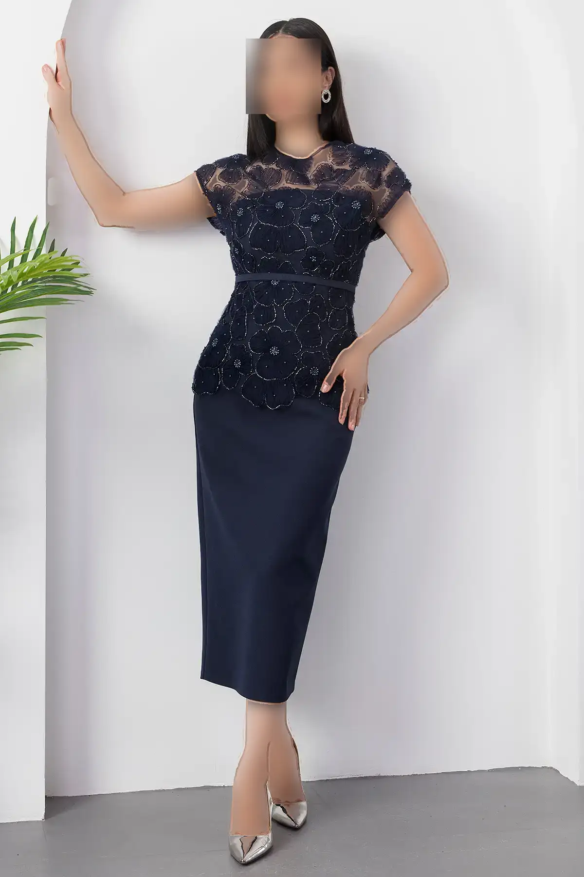 پیراهن ابریشمی کمربند دار با توری منجوق دار BAL144 – 11337