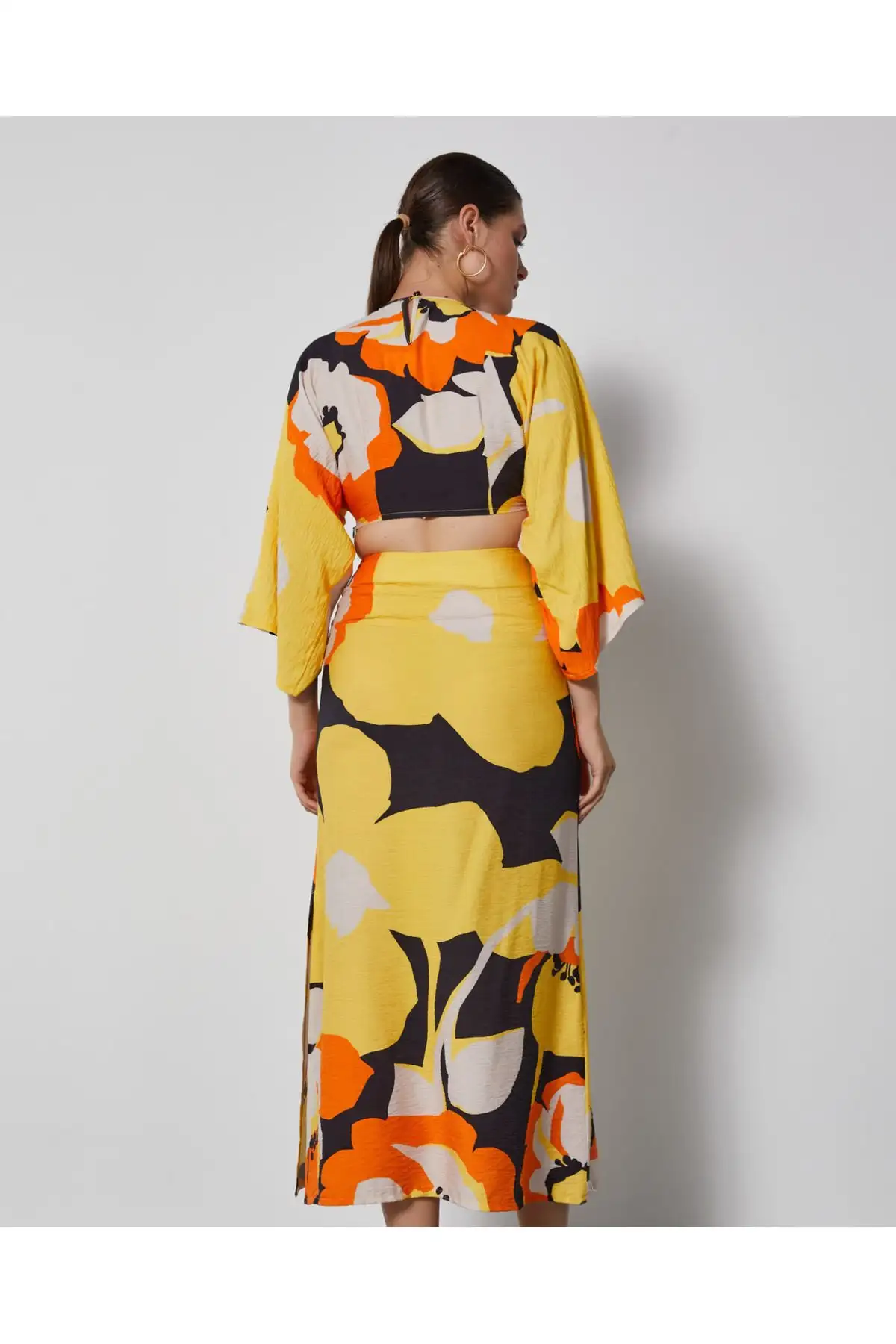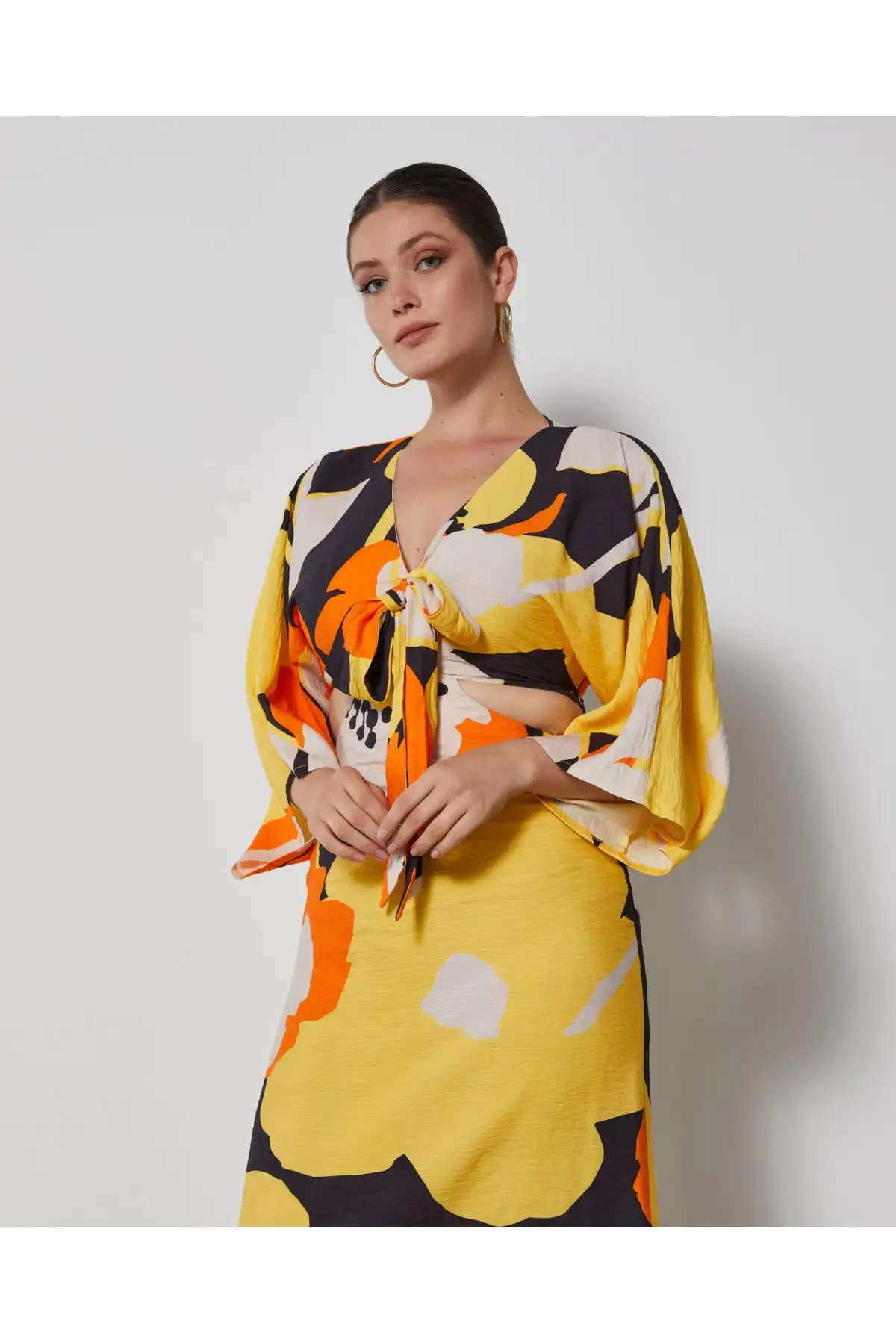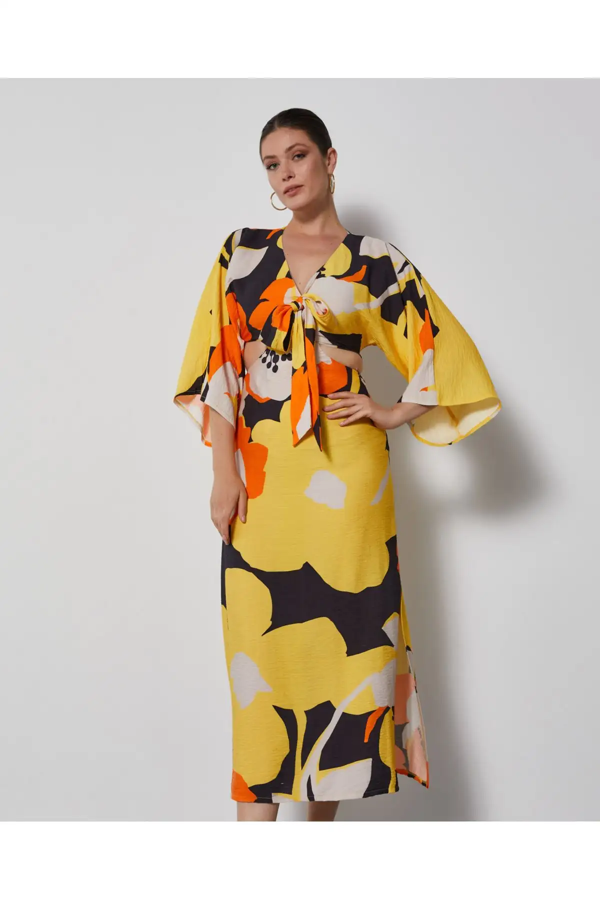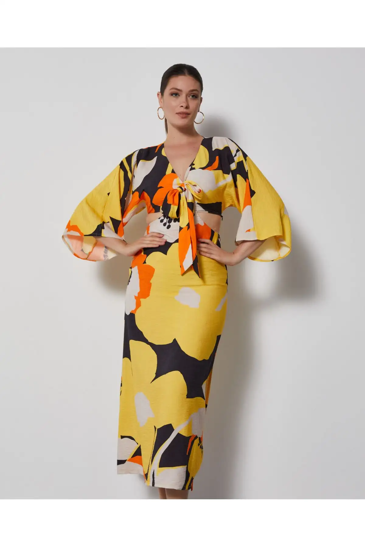پیراهن زرد طرح‌دار با یقه بل پنسریلی و بند جلو ۳۶۹۵۰ – 10472