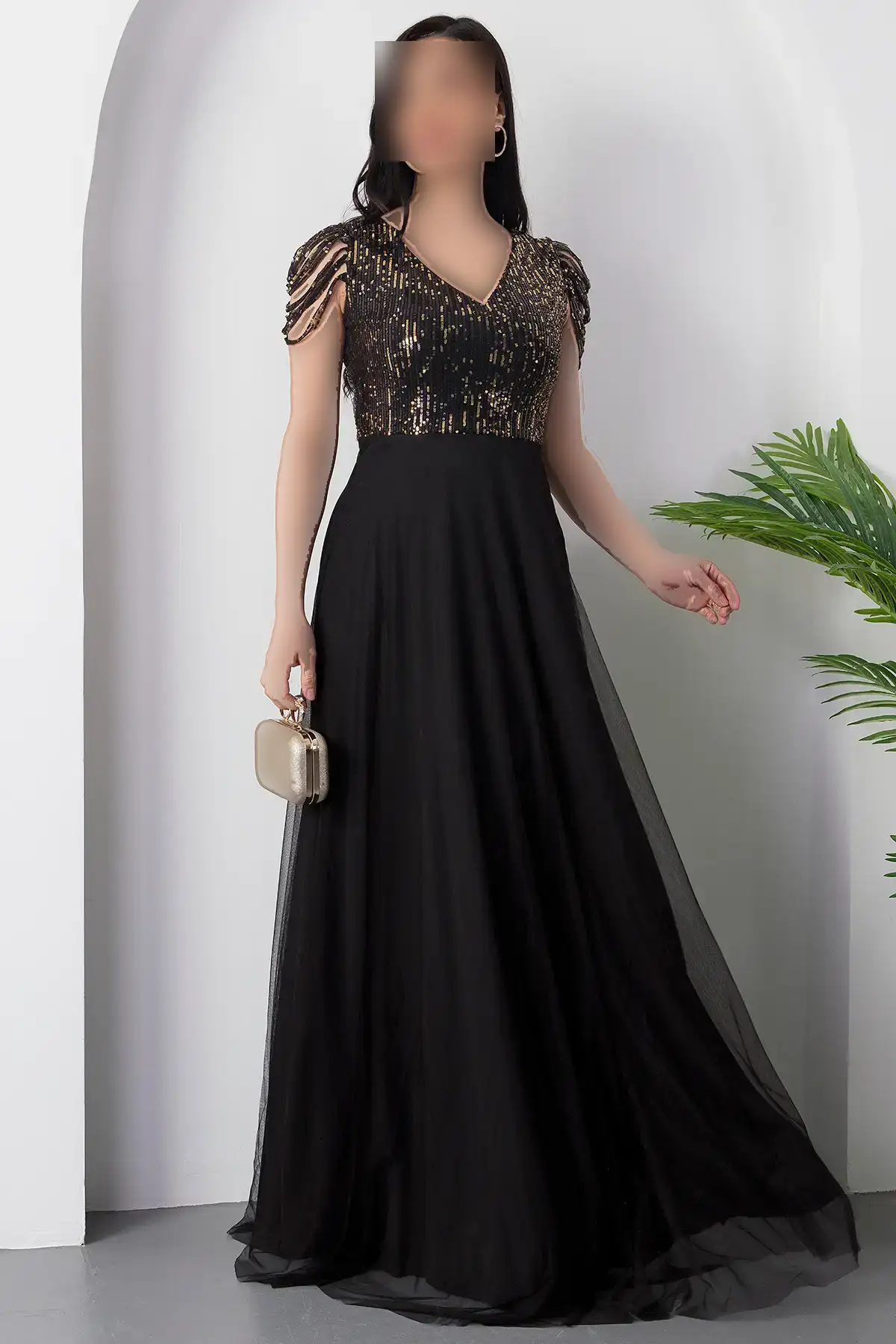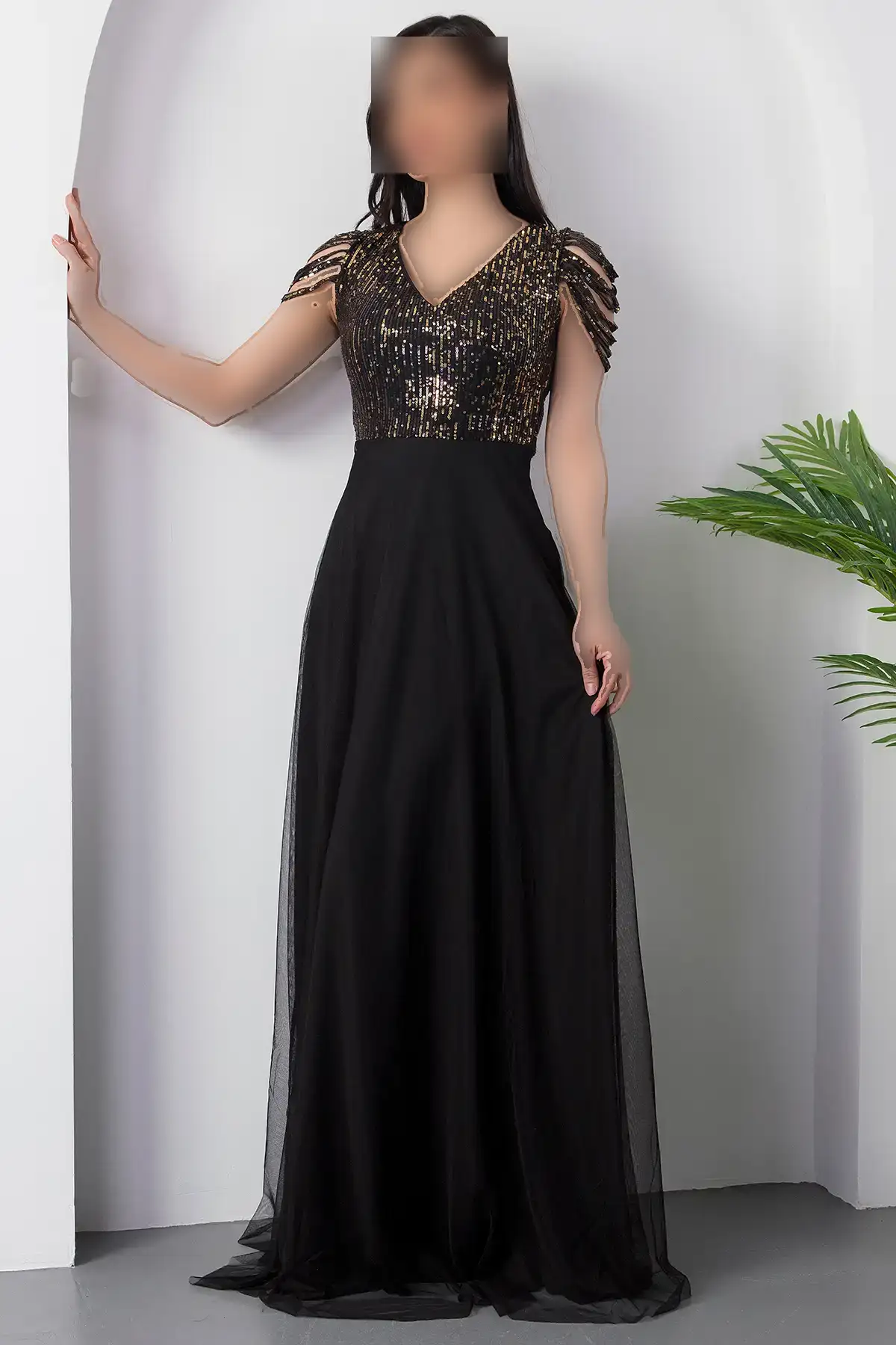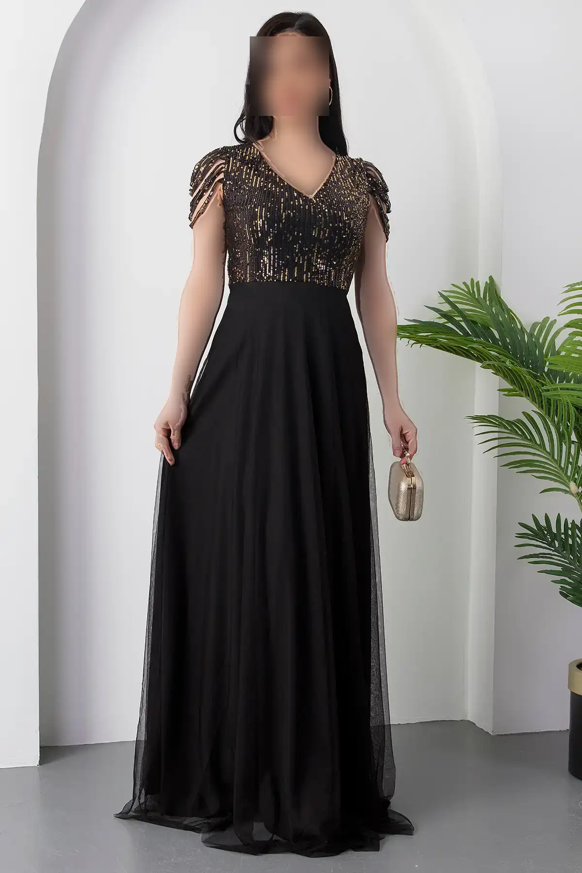 پیراهن مجلسی بلند با بالا پوشیده شده با پولک و پایین توری 13118 – 11364