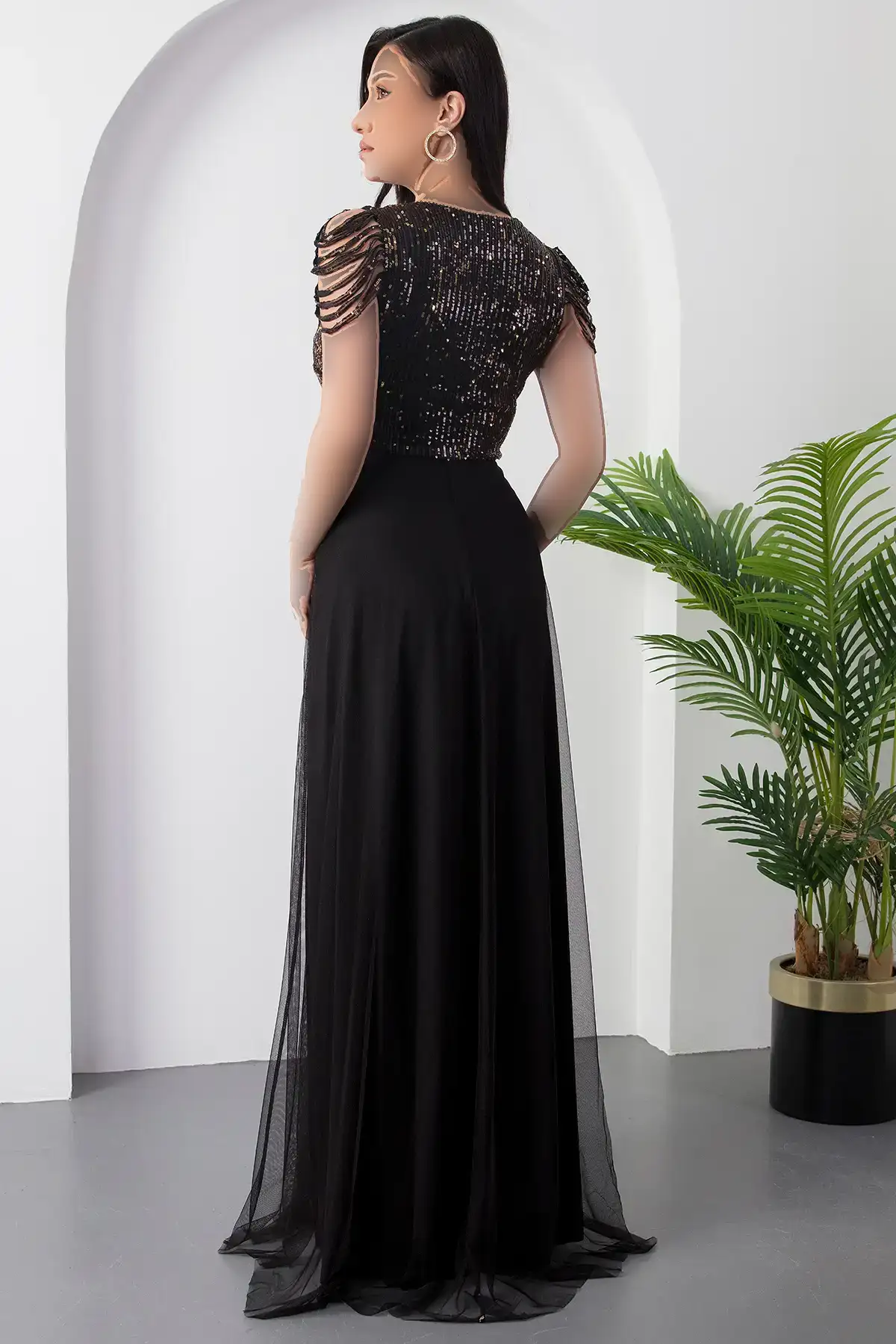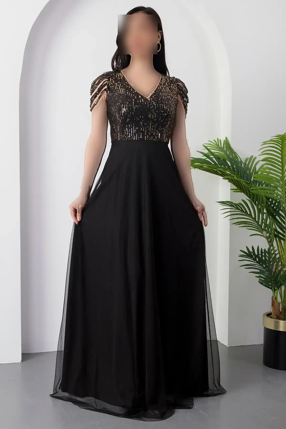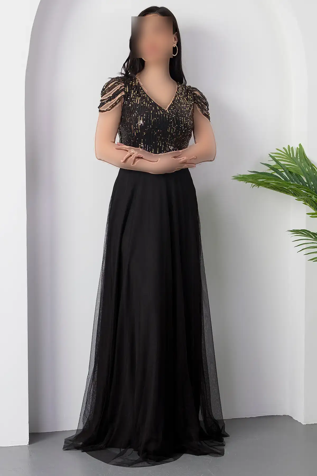 پیراهن مجلسی بلند با بالا پوشیده شده با پولک و پایین توری 13118 – 11364