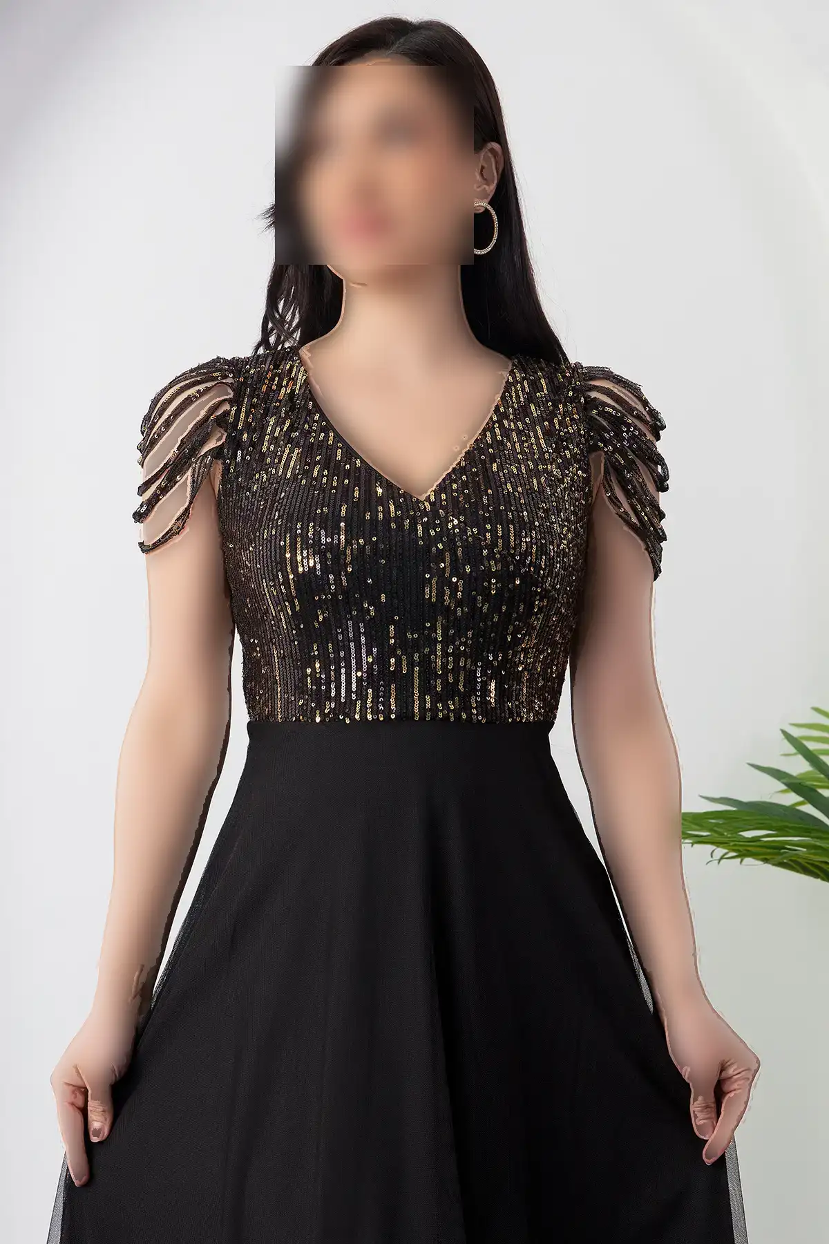بالا این پیراهن با پولکهای درخشان تزیین شده که ظاهری جذاب و خاص به آن میبخشد. طراحی یقه V آن نیز زیبایی را دوچندان کرده و جلوهای خاص به گردن شما میدهد.