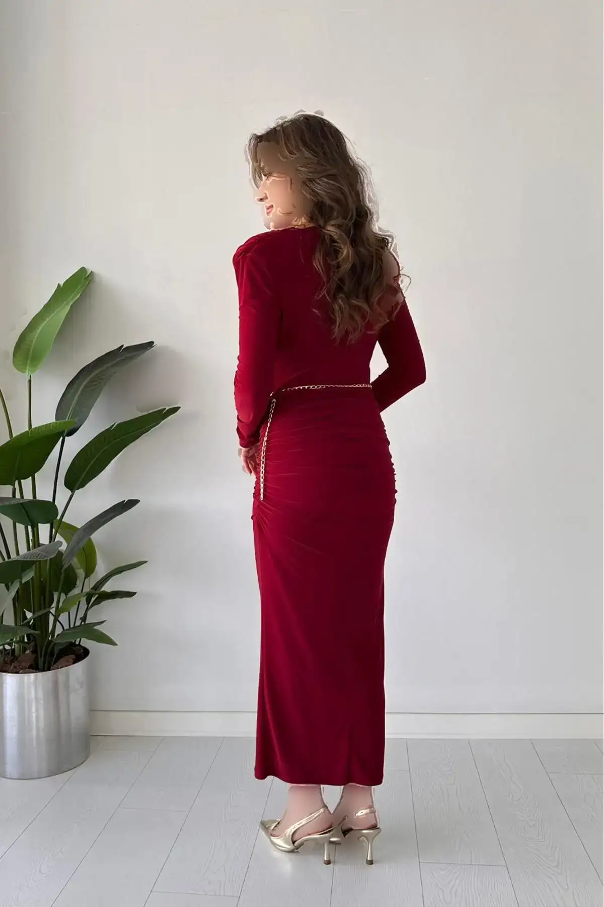 پیراهن مجلسی زنانه با کمربند زنجیری رنگ زرشکی خاص- 11986