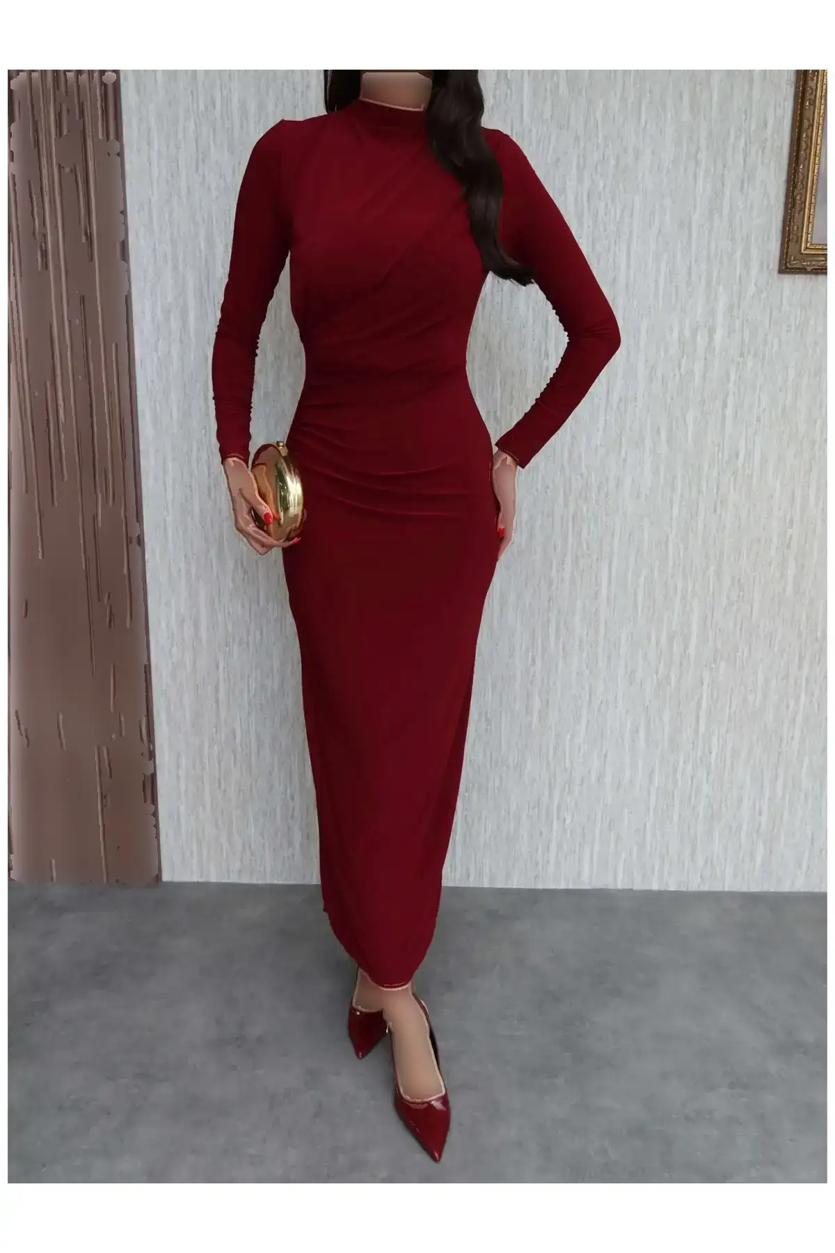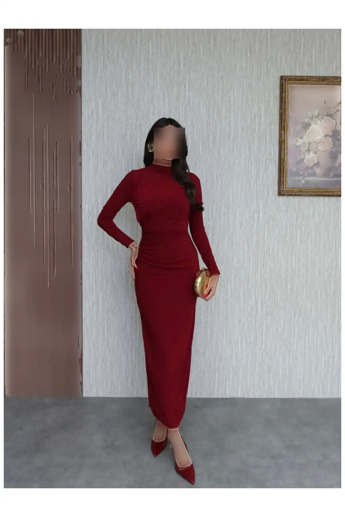 پیراهن مجلسی زنانه بلند با آستینهای بلند و چاک دار