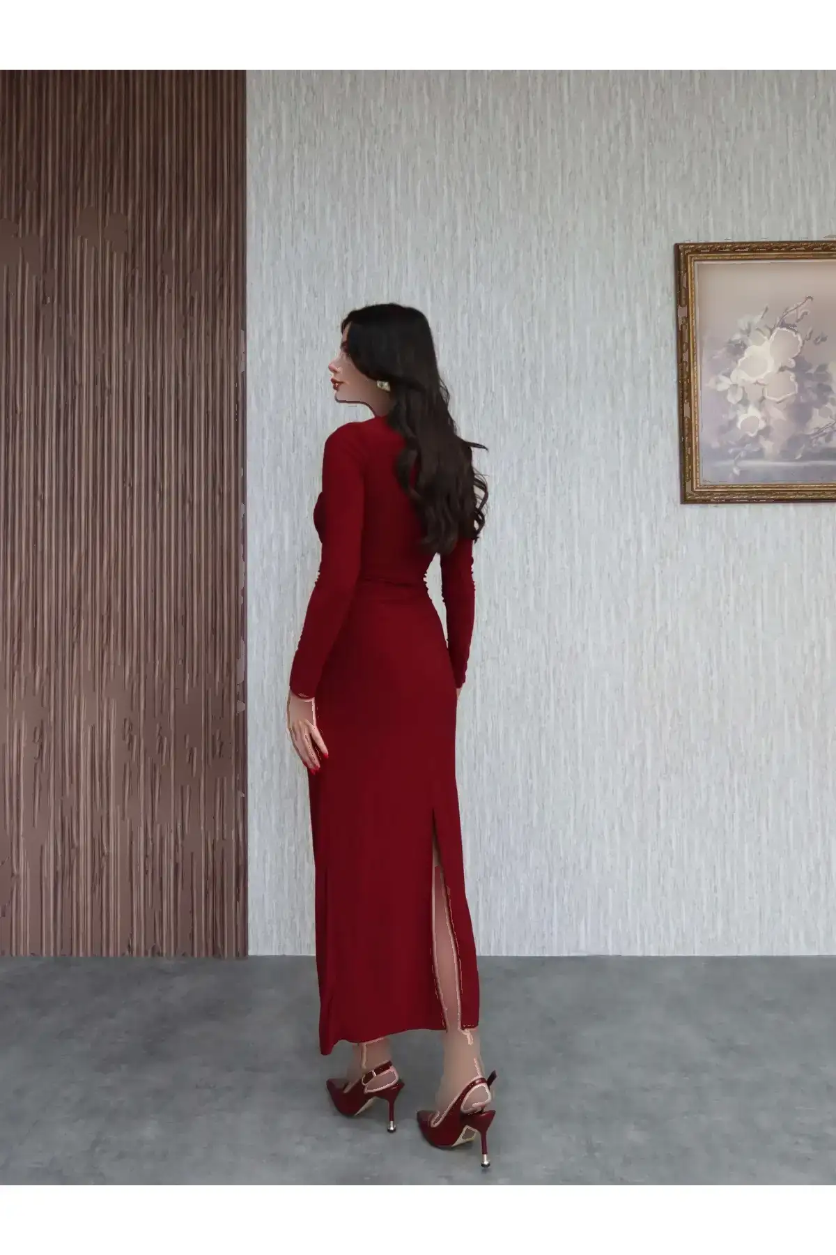 پیراهن مجلسی زنانه بلند با آستینهای بلند و چاک دار – 12026
