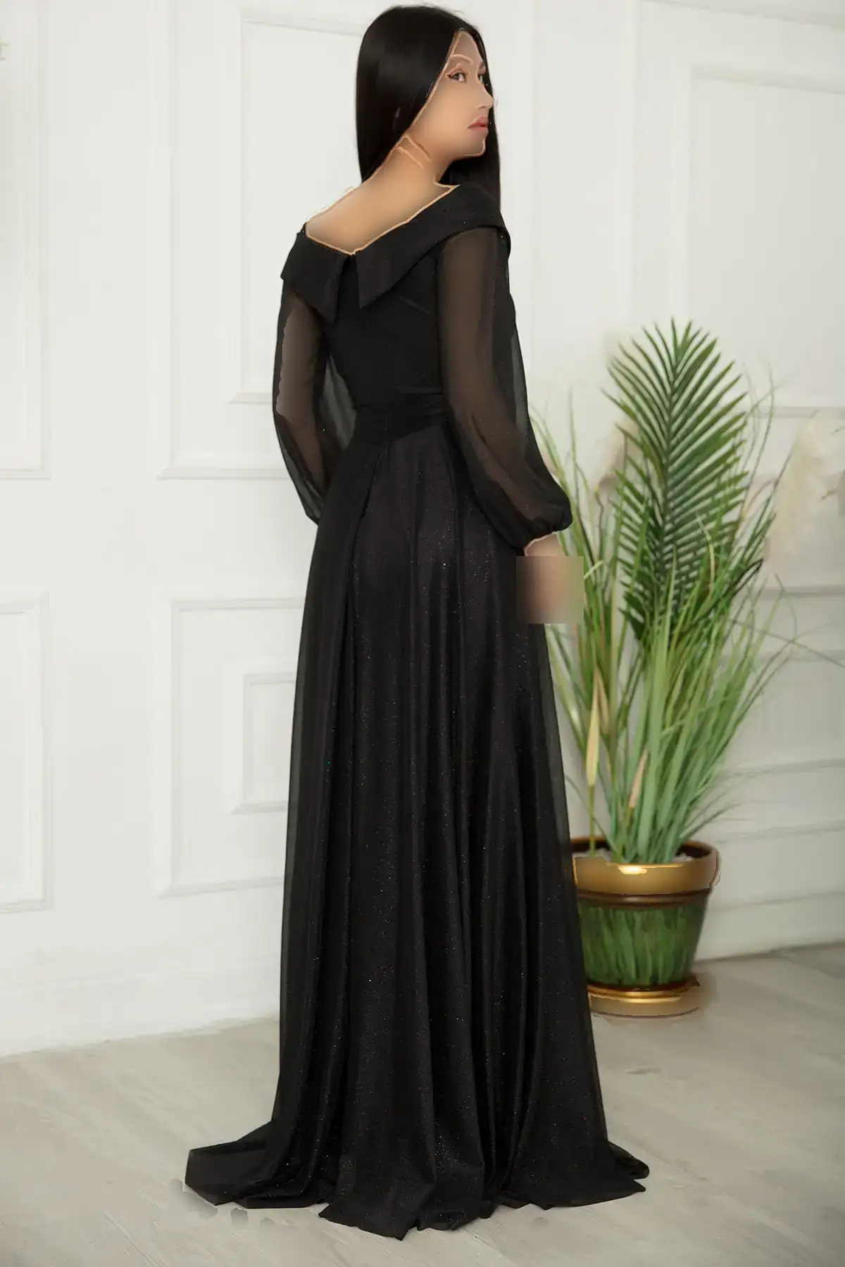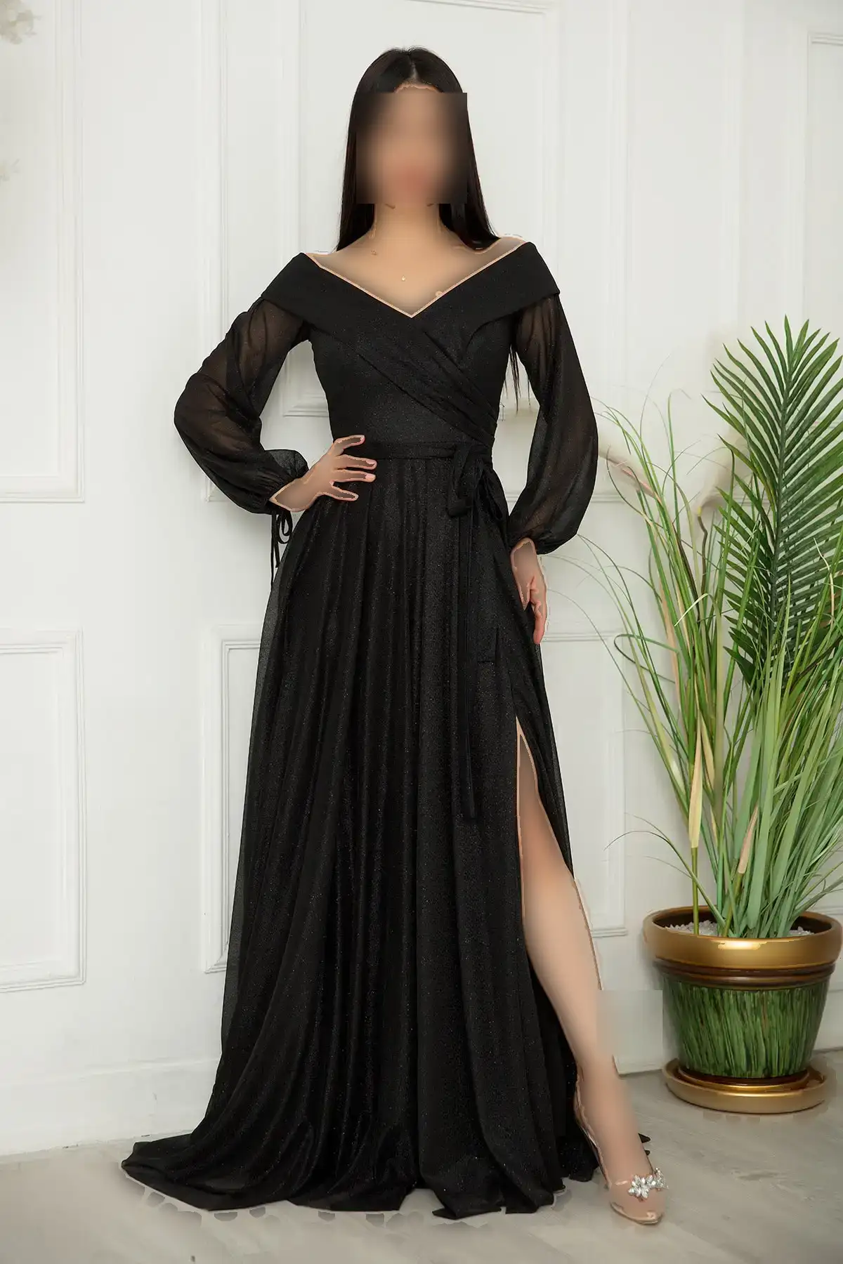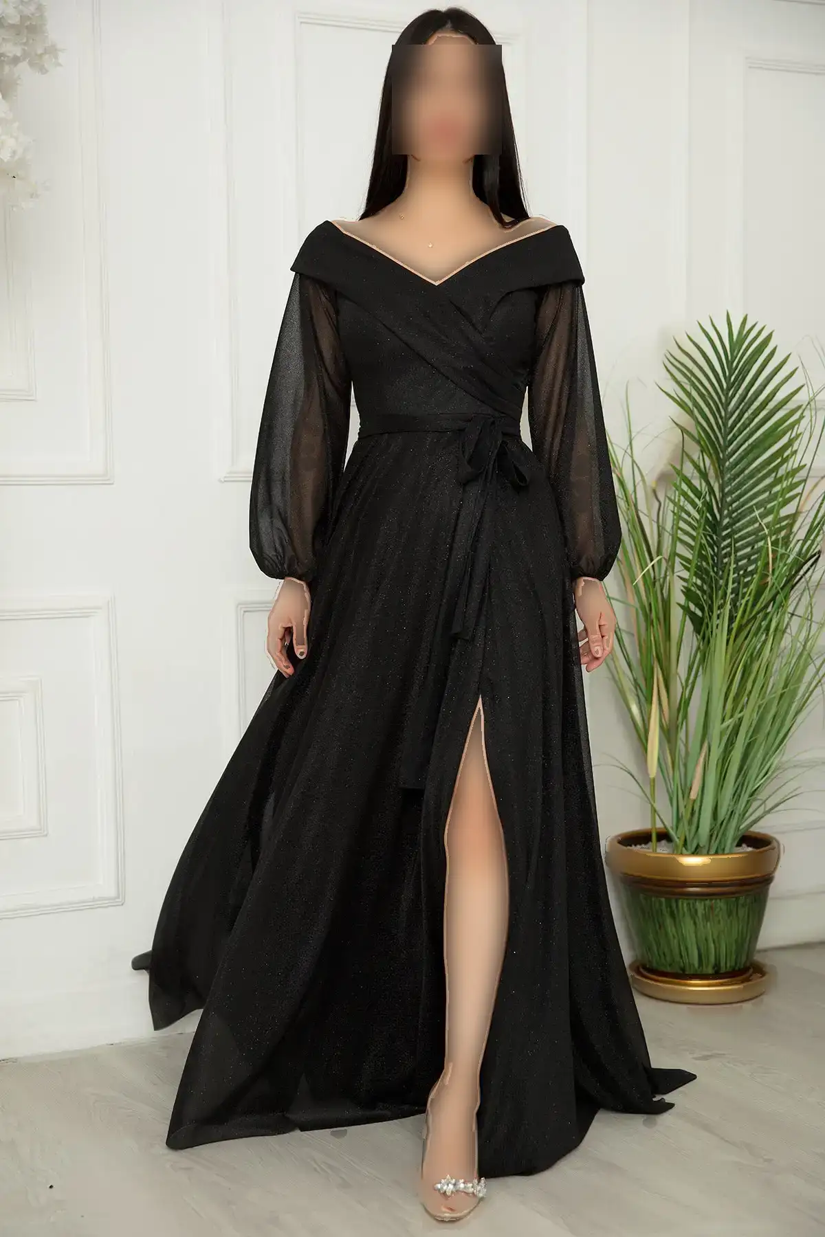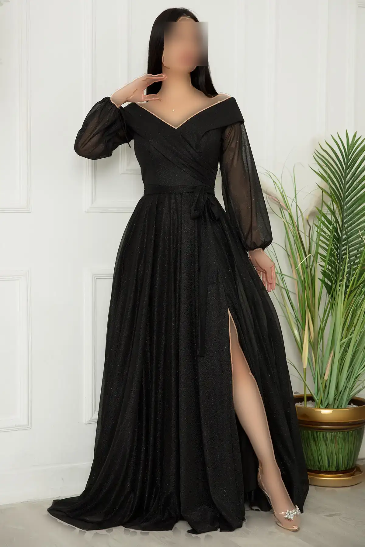 منجوق سنگی گلدوزی شده طرح خاص لباس بلند نخی شانه دار مشکی – 1361