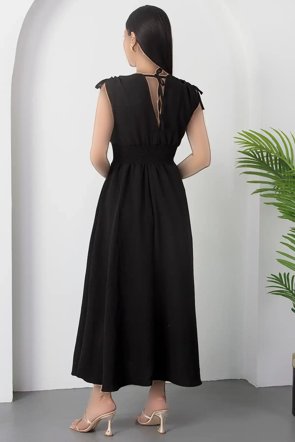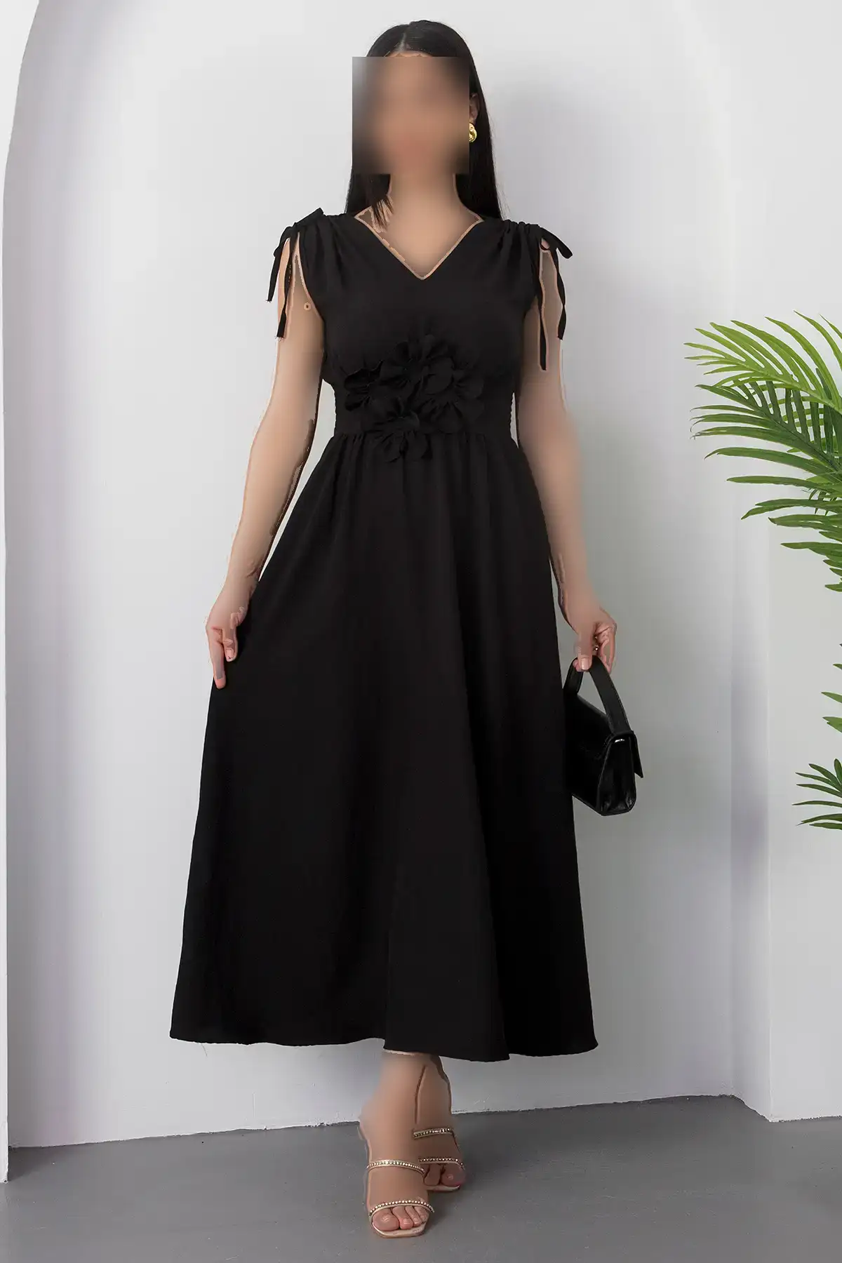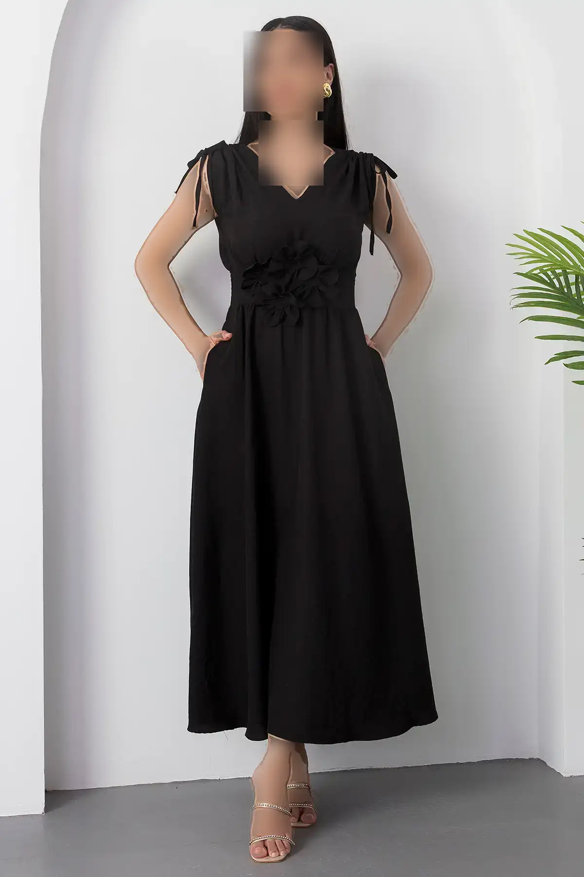 این پیراهن با رنگ مشکی و جزئیات زیبا برای فصلهای مختلف سال طراحی شده و به راحتی با اکسسوریهای متنوع قابل ست کردن است. شما میتوانید آن را با کفشهای پاشنهدار یا کفشهای راحتی بپوشید.