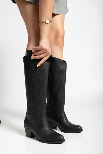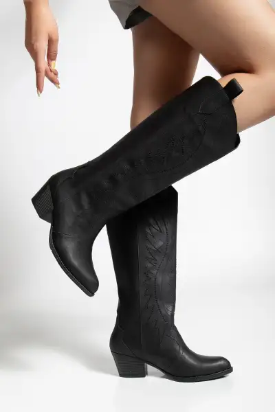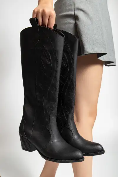 چکمه زنانه بلند چرم سیاه وسترن اورجینال با طراحی برجسته مشکی – 13151