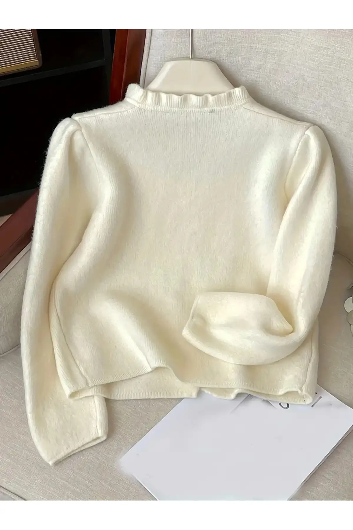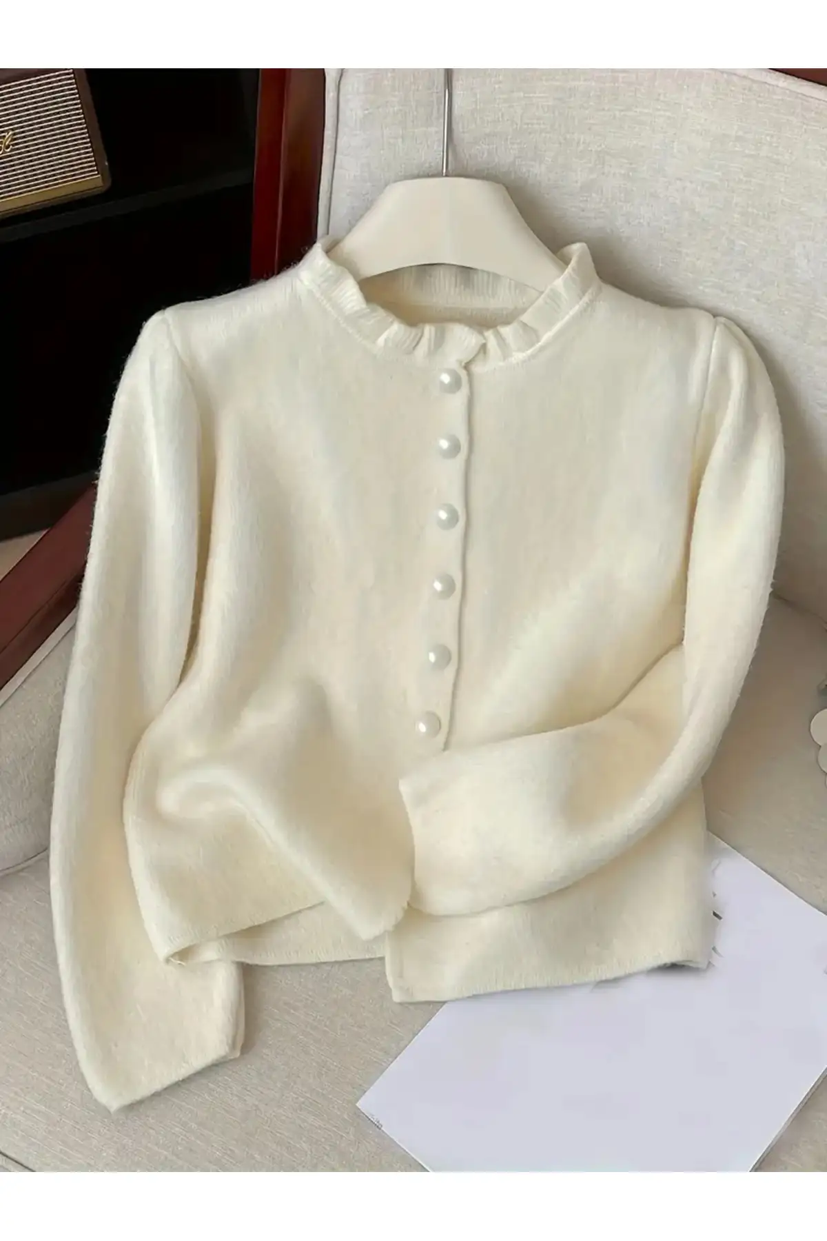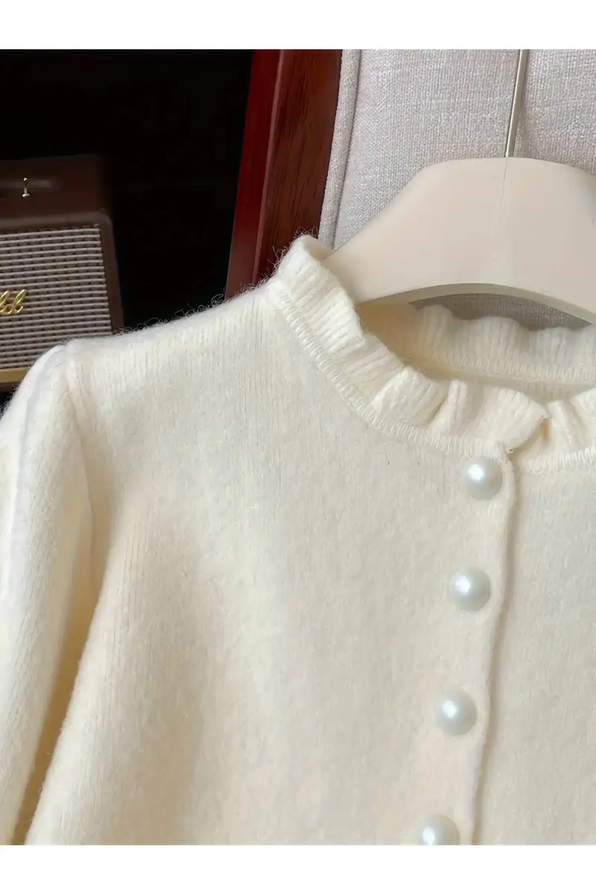 یقه گرد و آستینهای بلند این ژاکت در کنار جزئیات چیندار ظریف، ترکیبی از زیبایی کلاسیک و لطافت زنانه را به نمایش میگذارد دکمههای جلوی لباس نیز با طراحی ساده اما هماهنگ با مرواریدهای تزئینی، به آن جلوهای ظریف و لوکس بخشیدهاند رنگ روشن و بافت منظم آن، حس نظم و آرامش بصری ایجاد میکند و بهخوبی با شلوار جین روشن، دامن با پارچه لطیف یا حتی شلوار پارچهای ترکیب میشود