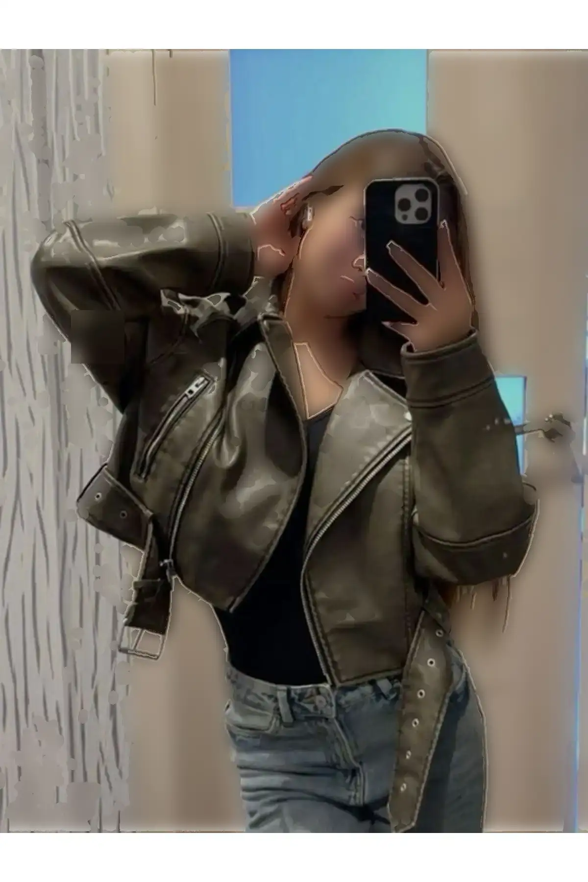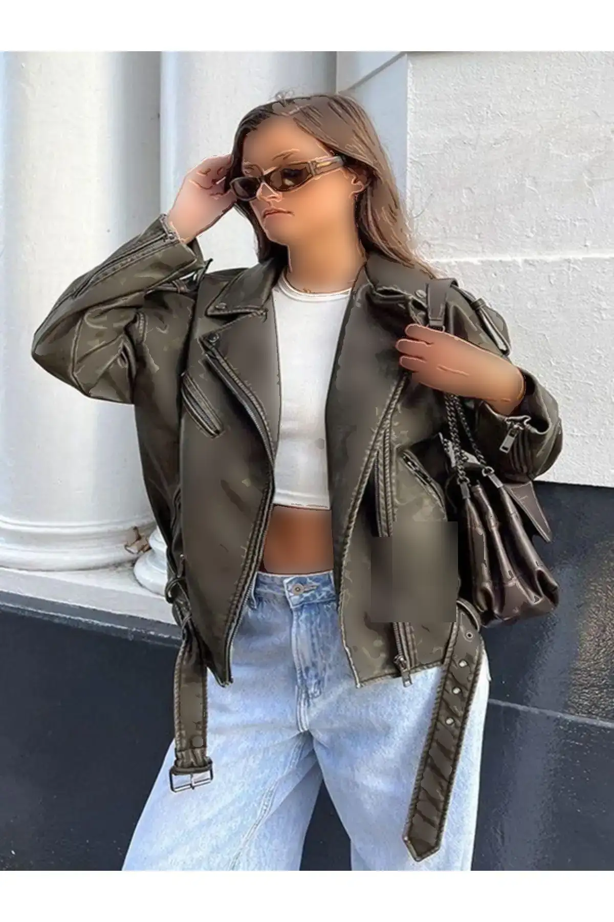ژاکت بایکِر چرم اورسایز با کمربند – 10349