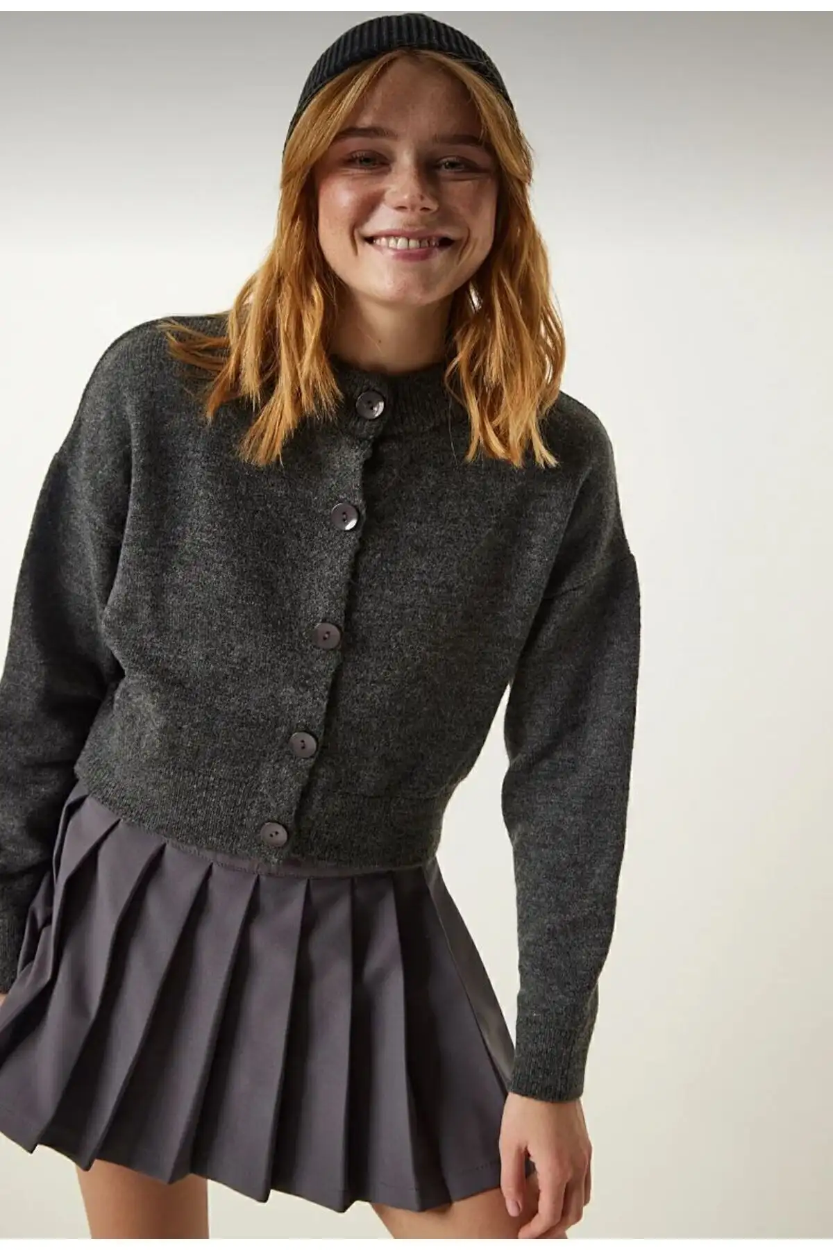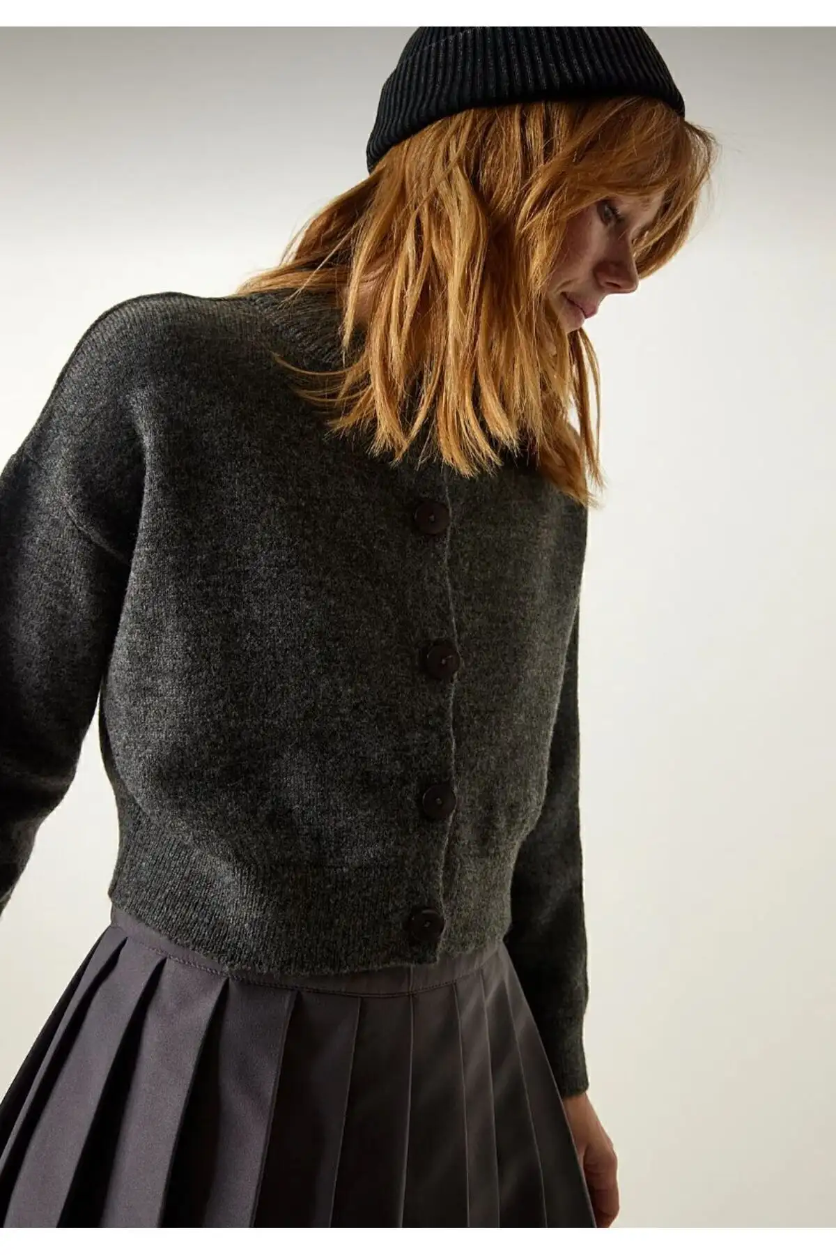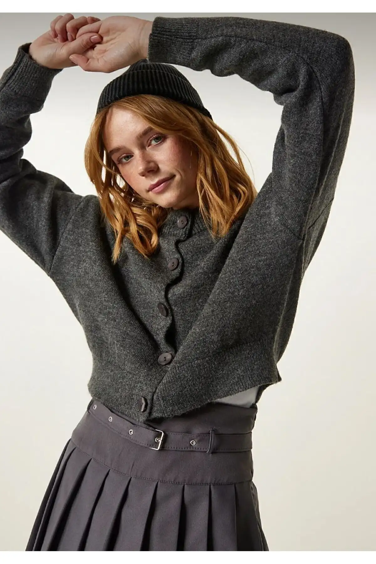 کاردی آنتراسیت دکمهای زنانه کاردی زنانه تیلیا کراپ خاکستری تیره بافتنی – 11597