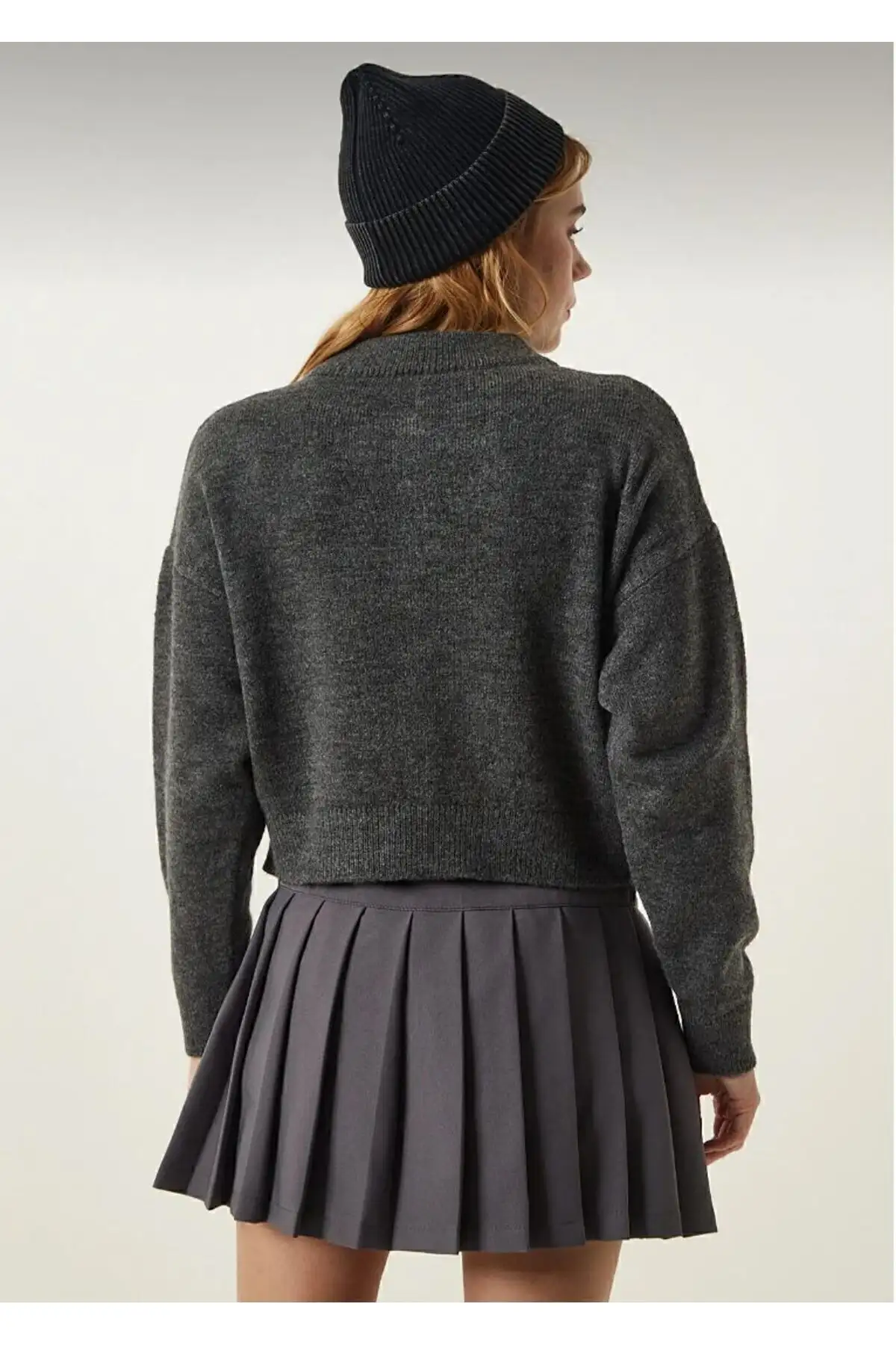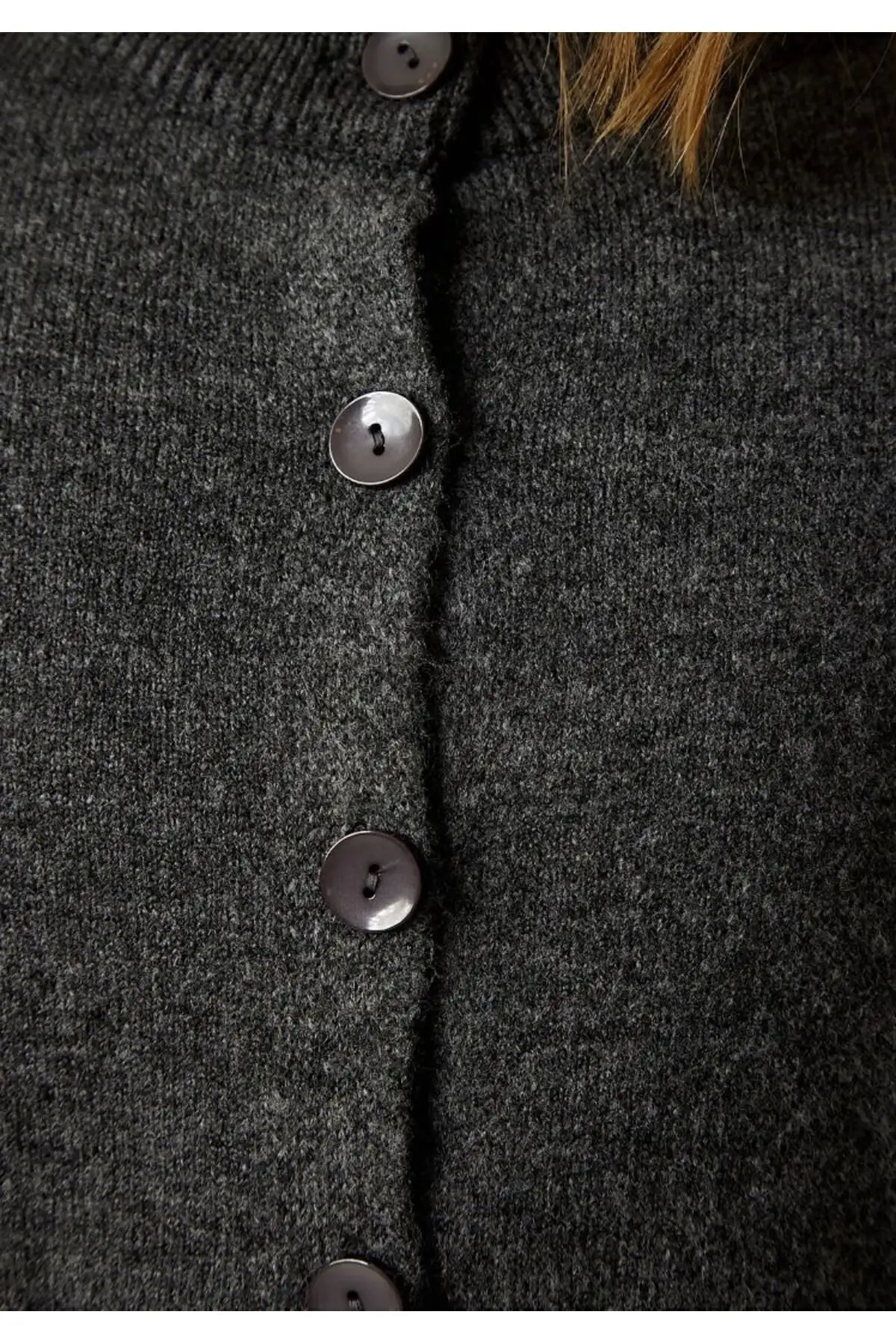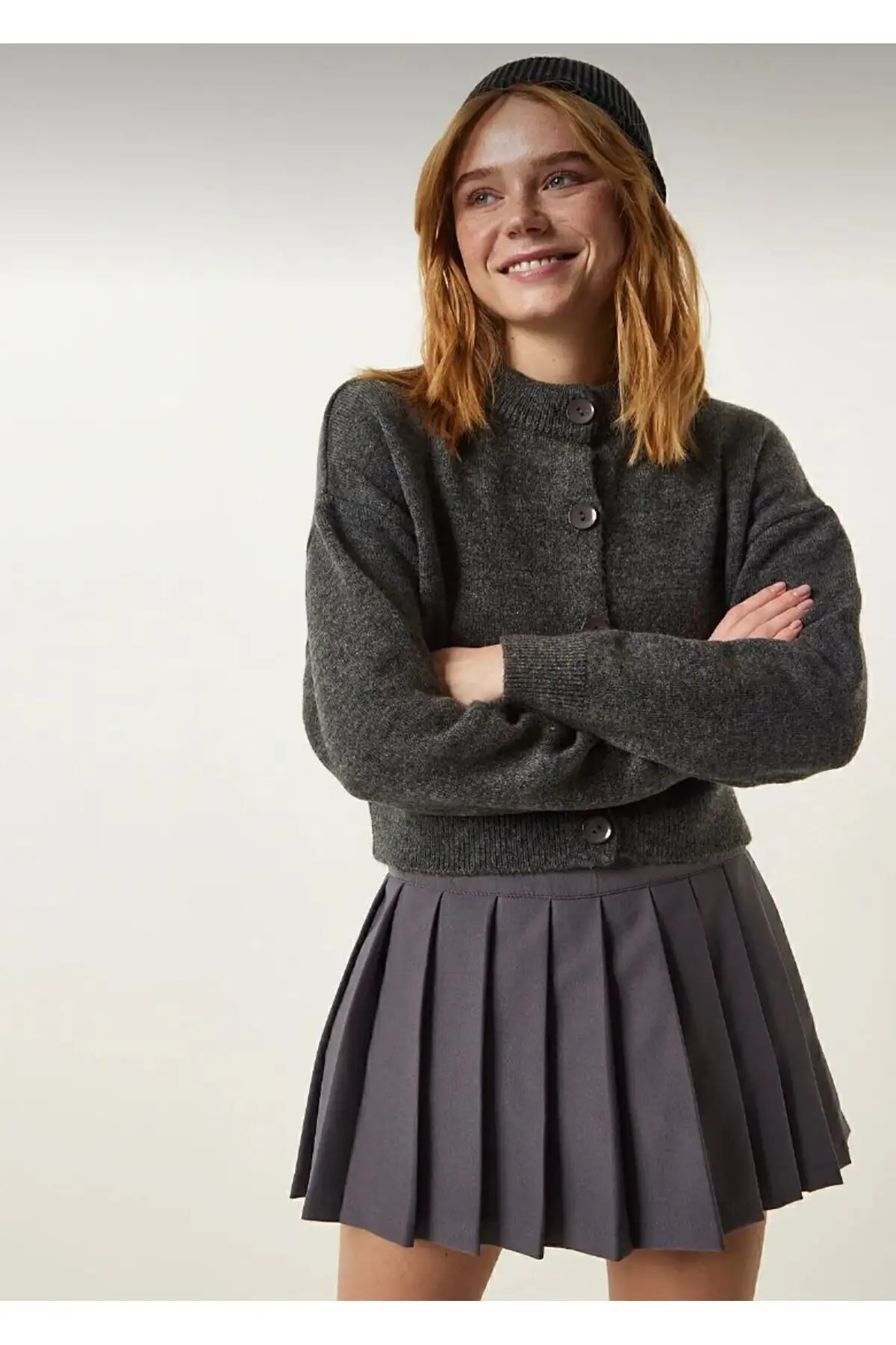 کاردی آنتراسیت دکمهای زنانه کاردی زنانه تیلیا کراپ خاکستری تیره بافتنی – 11597