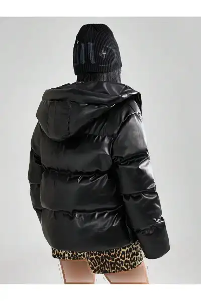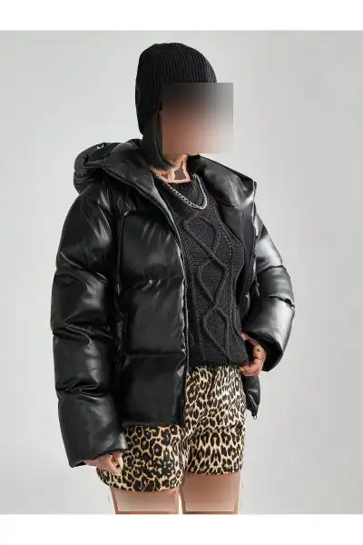 کاپشن بادی چرم مشکی با کلاه زنانه – 12627