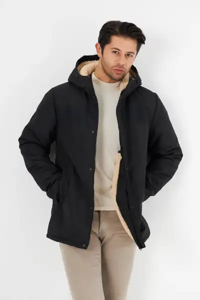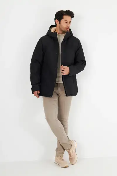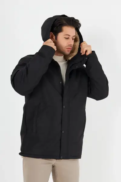 کاپشن ترک زمستانی مردانه با کلاه مشکی و ضد آب و مقاوم در برابر باد
