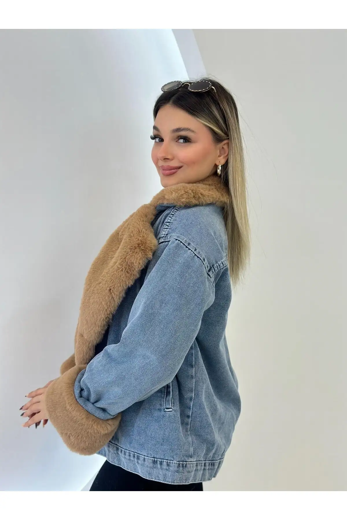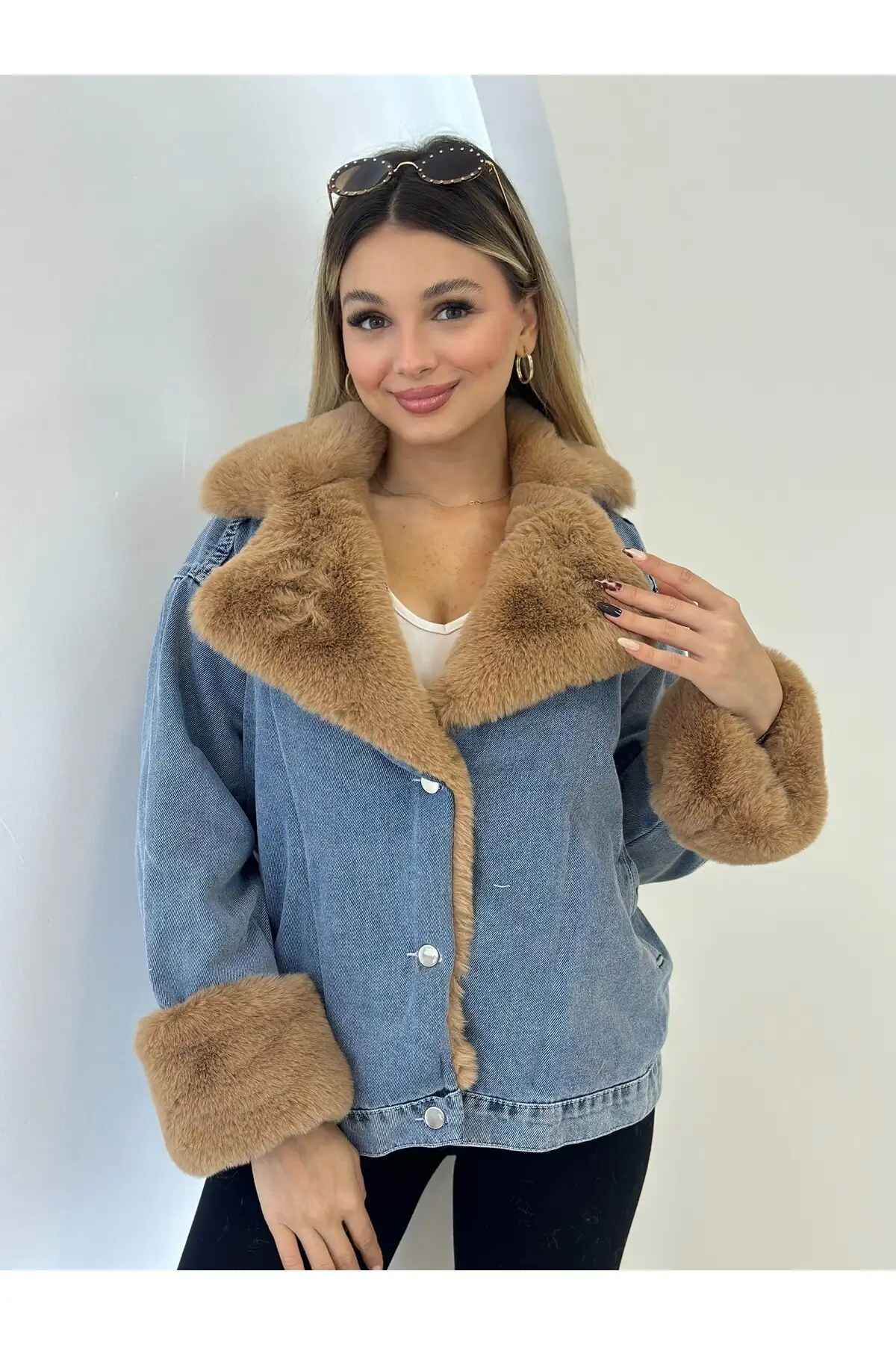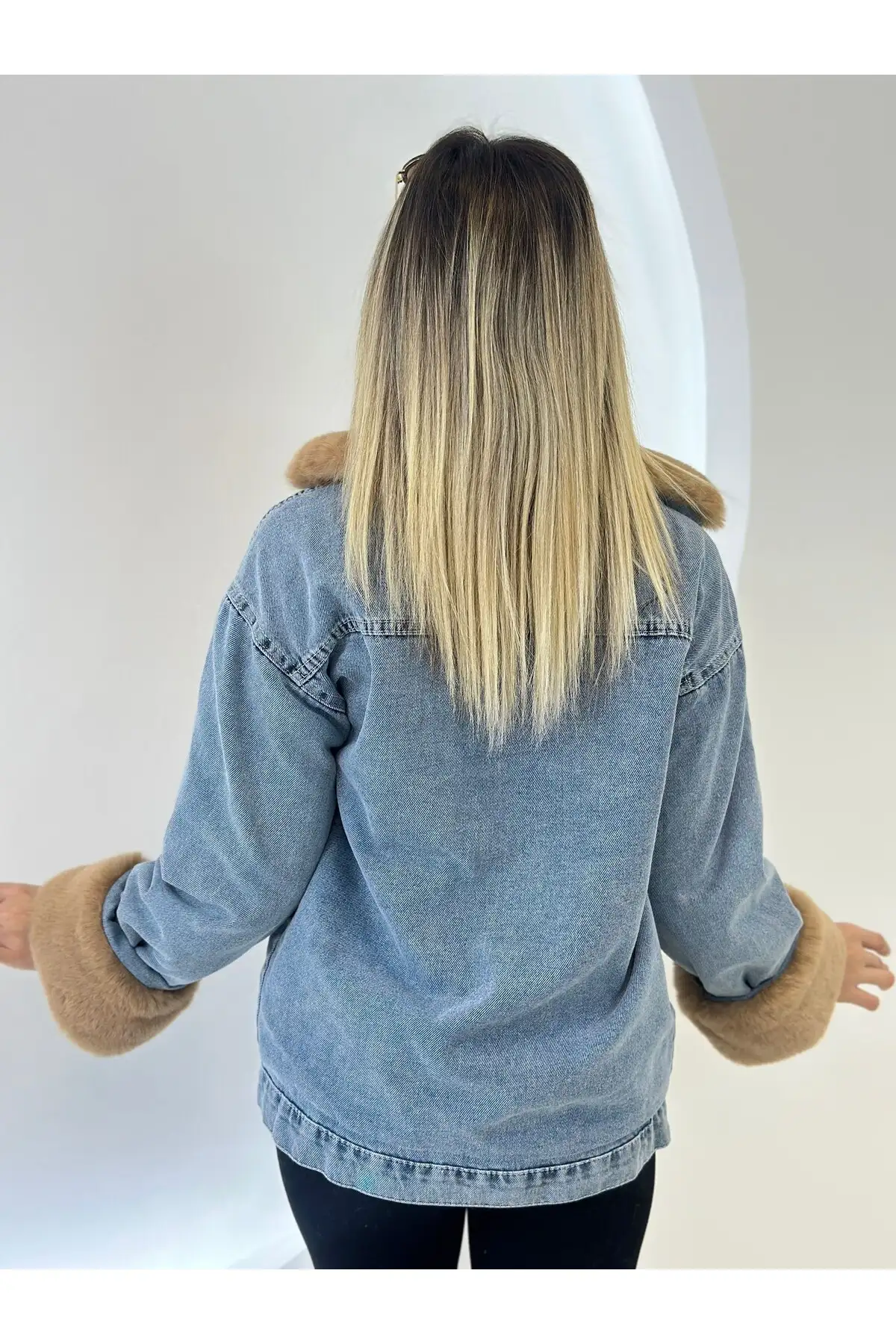 کاپشن جین زنانه با دکمه و خز سفید – 11500