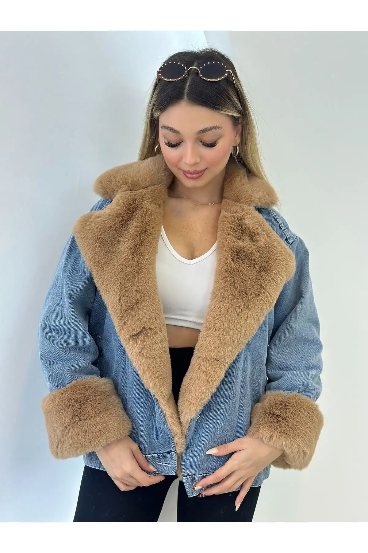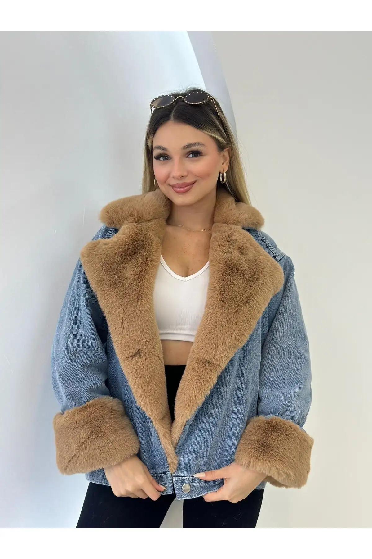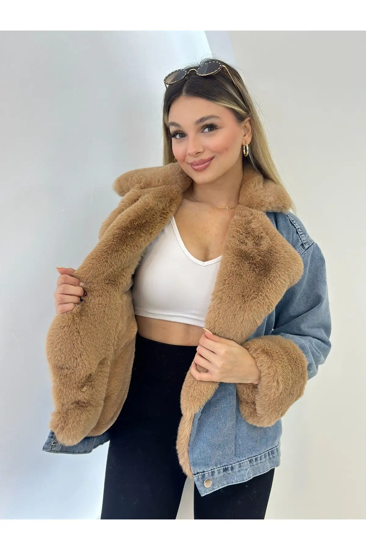 کاپشن جین زنانه با دکمه و خز سفید – 11500