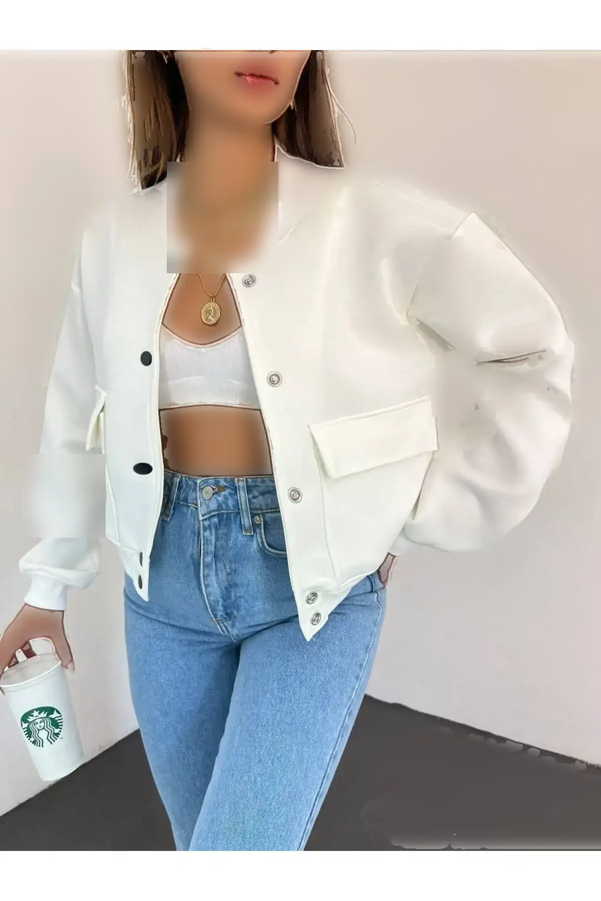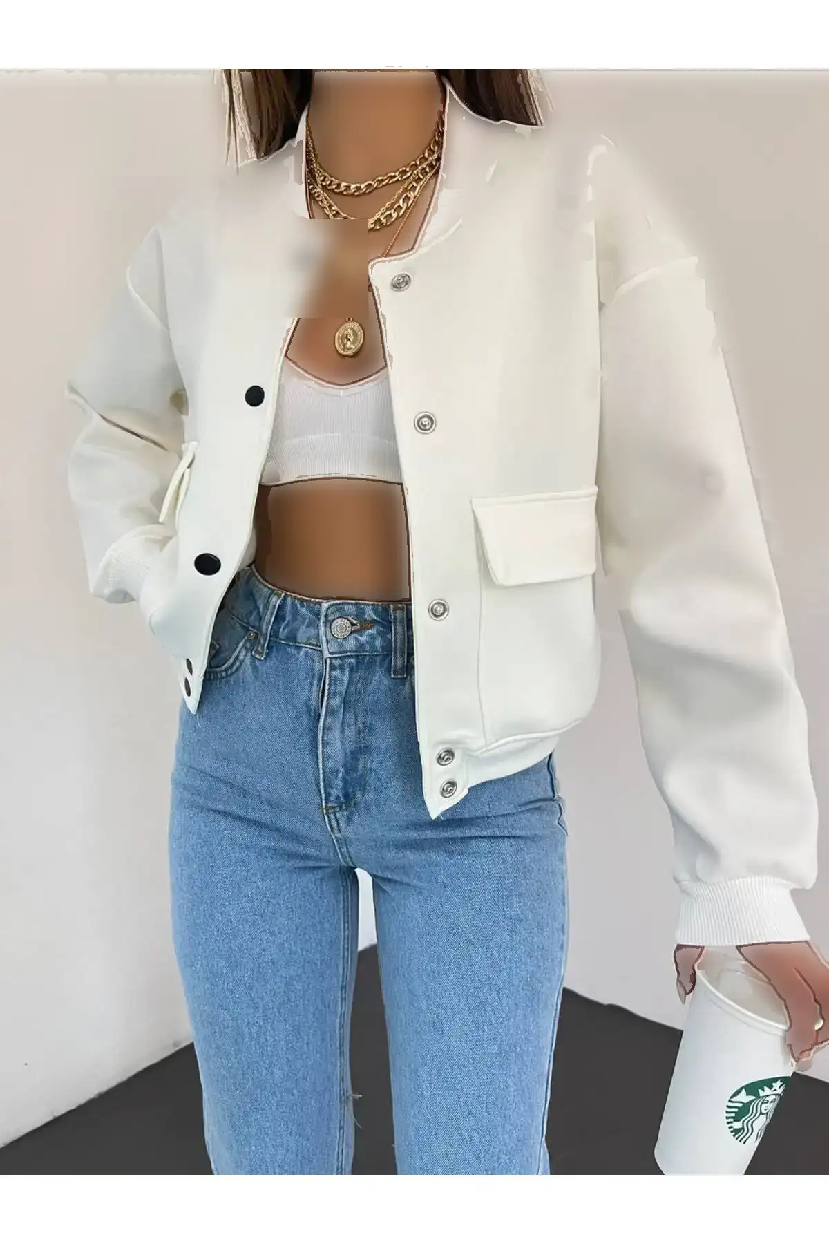 کاپشن بمبئی زنانه با رنگ سفید و طراحی ساده، به راحتی با سایر لباس‌ها هماهنگ می‌شود.