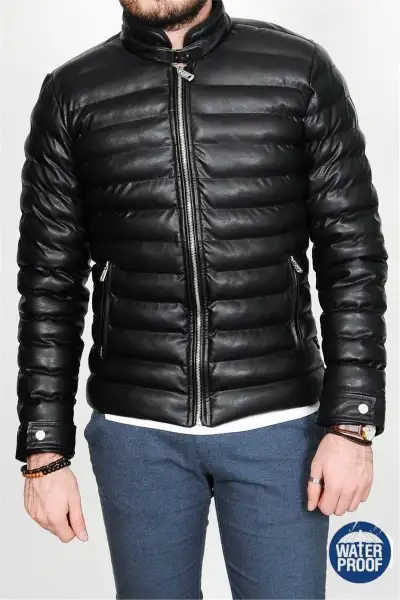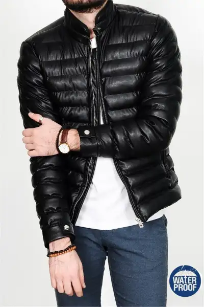 کاپشن چرم مردانه مشکی با طراحی باریک و داخل پُر از پشم و جیب داخلی یک انتخاب ایده‌آل برای آقایان است که به دنبال سبکی شیک و مدرن هستند.