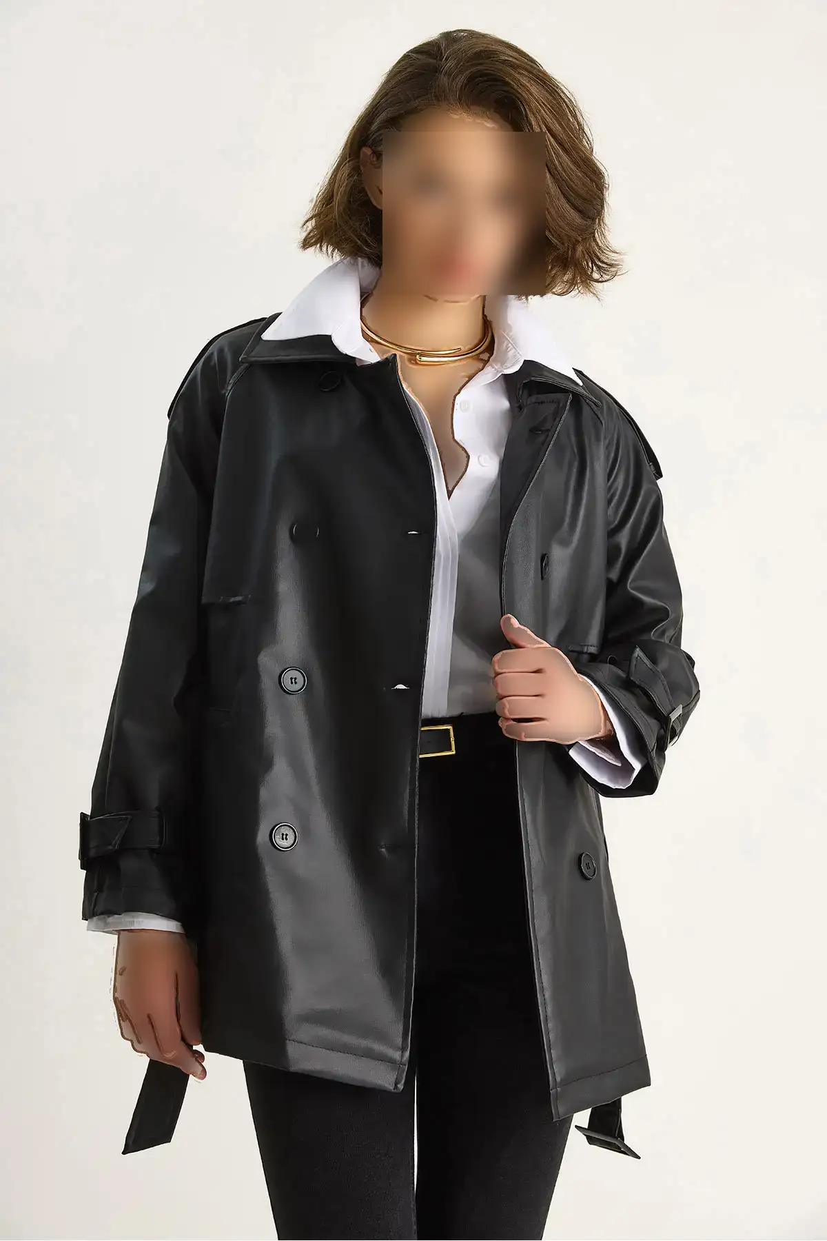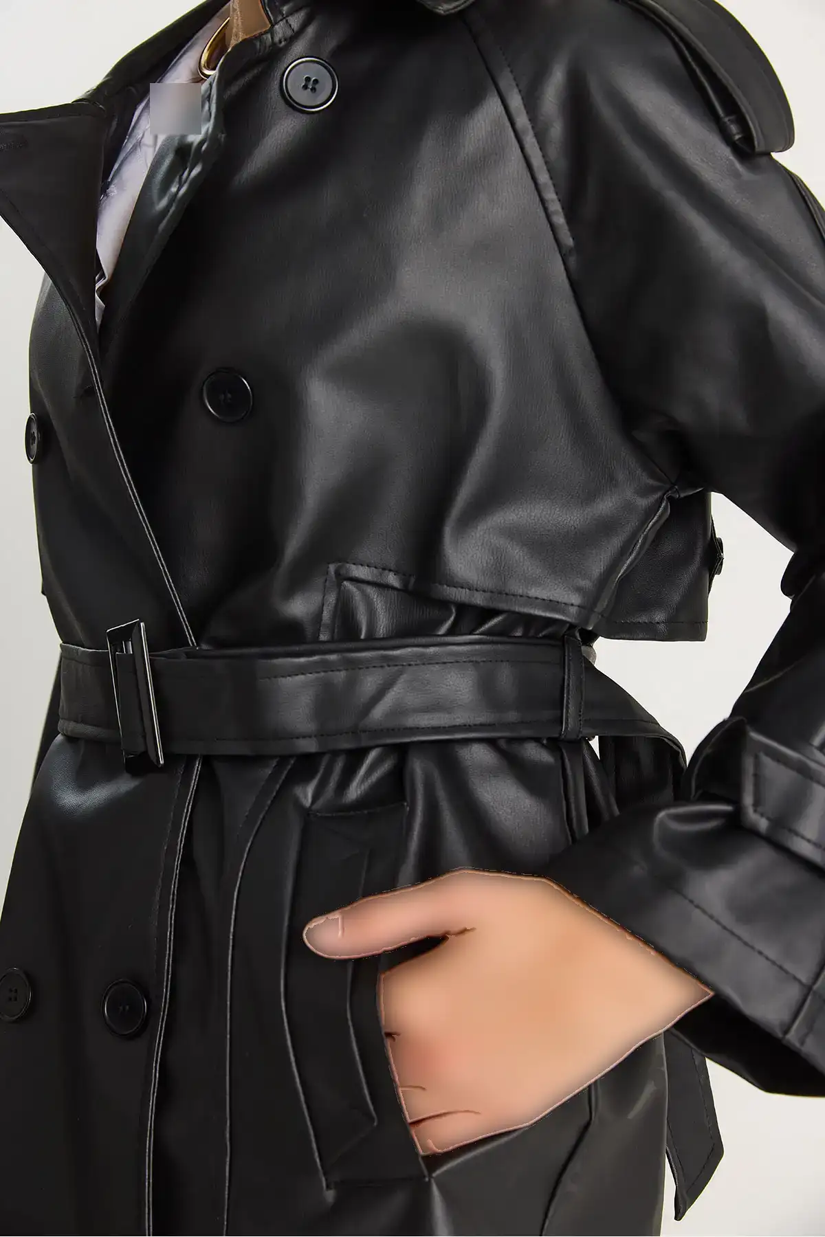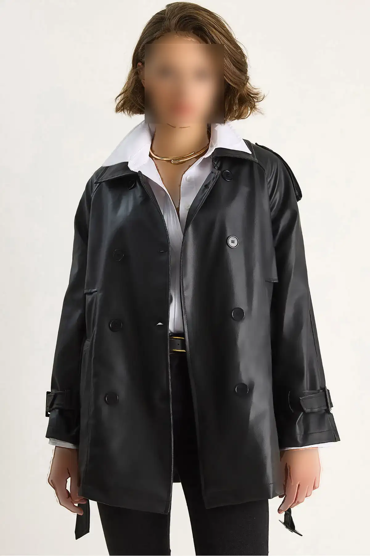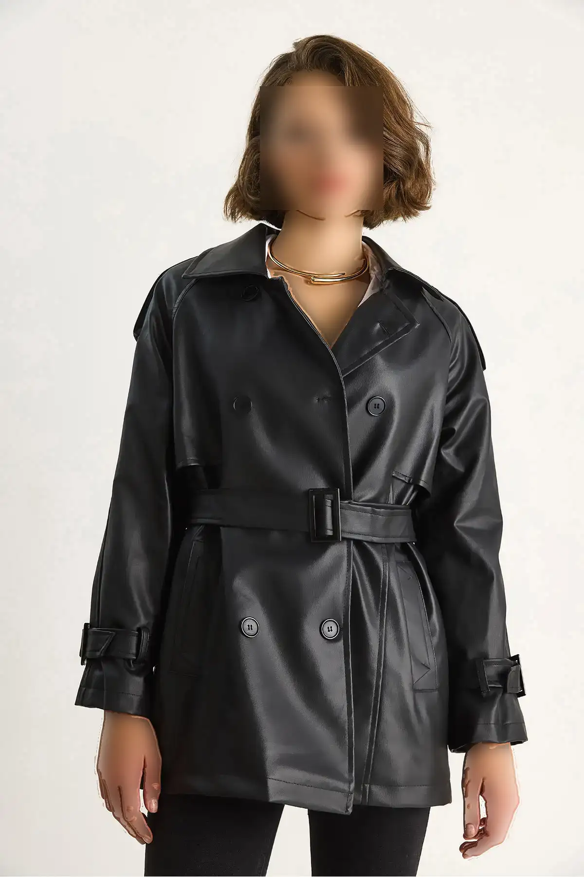 کاپشن کوتاه اور سایز از چرم مصنوعی با یقه کلاسیک و کمربند زنانه – 11739