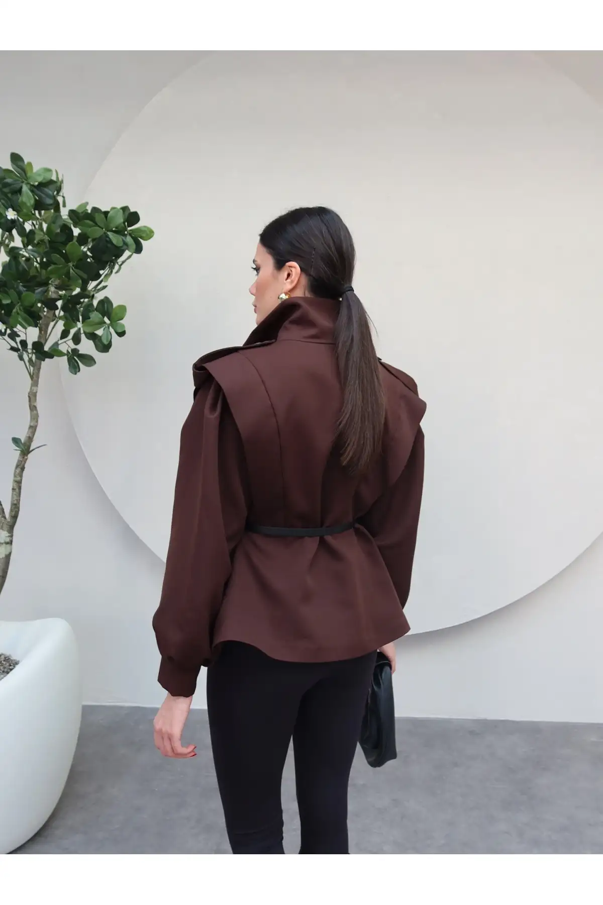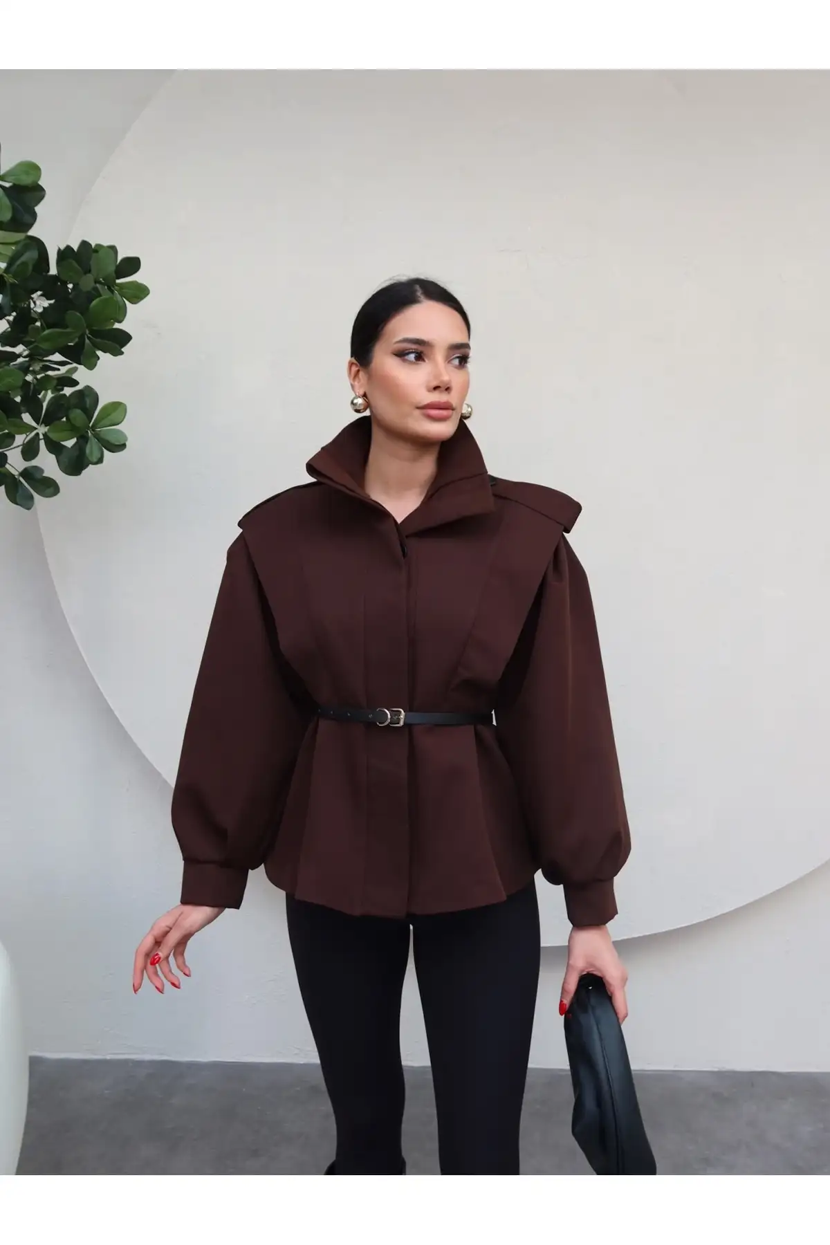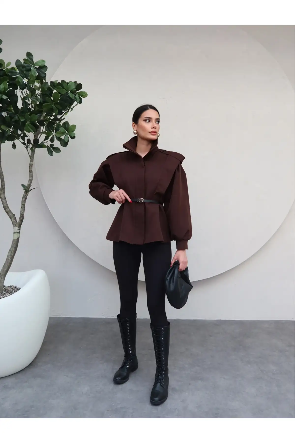 کت زنانه ترک با کمر رنگ قهوهای تلخ