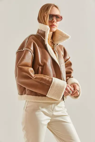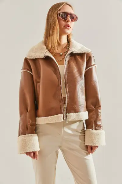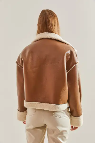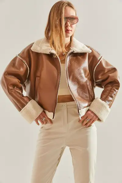 کت چرمی زنانه خز دار ترک طرح جدید سال 2025 و جیب کناری – 13042