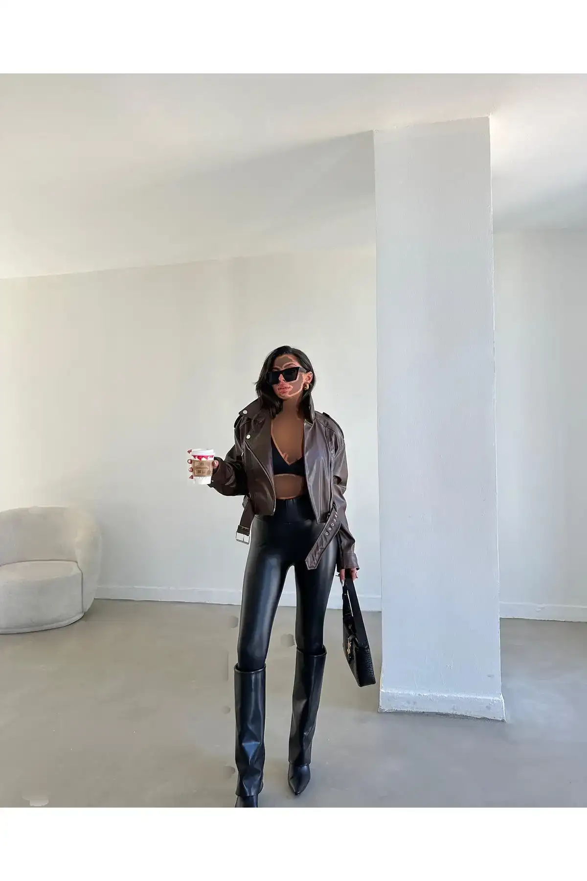 کت چرم بایکر زنانه رنگ قهوه‌ای تیره سایز بزرگ فصل جدید