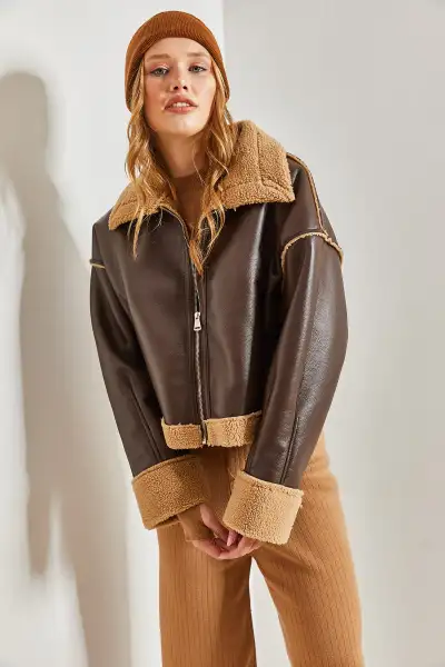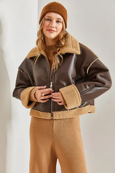کت چرم زنانه با آستری پشمی و جیبهای کناری ترک – 12618