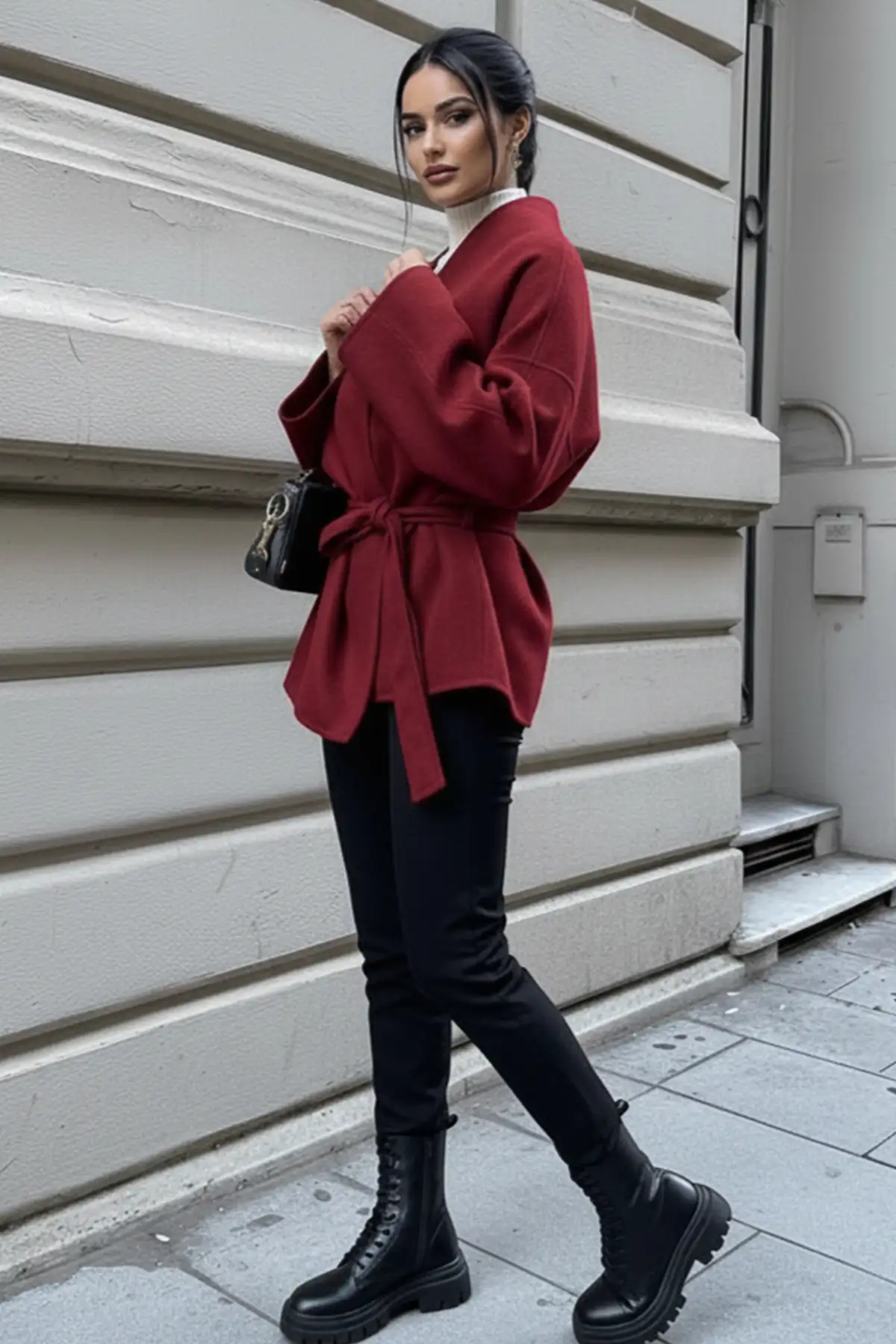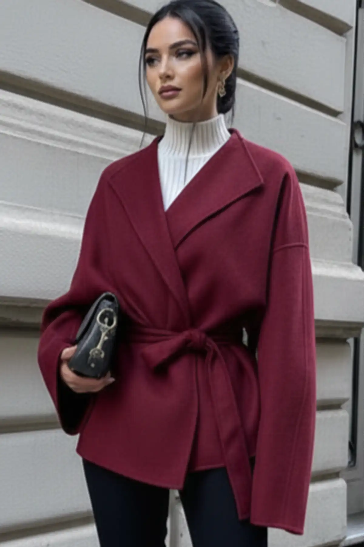 مناسب برای فصل زمستان، این کت کشمیر زنانه با جزئیات بند رنگ خاص به شما کمک می‌کند تا در دماهای پایین احساس گرما کنید و در عین حال ظاهر خود را حفظ کنید.