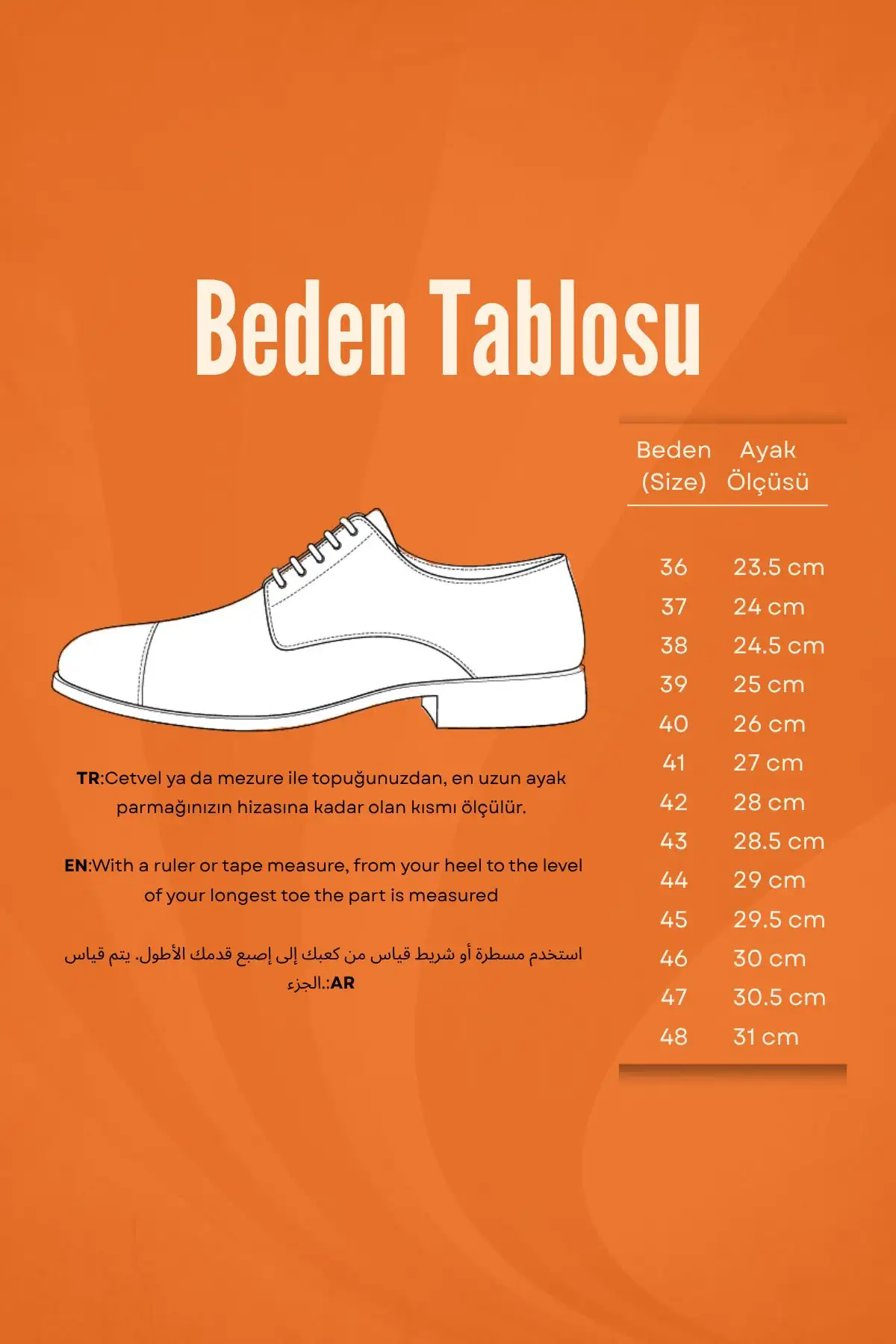 کفشهای مردانه ما در سایزهای مختلف (۳۶ تا ۴۸) موجود میباشند تا هر فردی بتواند سایز مناسب خود را پیدا کند. این تنوع در سایز، طراحی خاصی به این محصول بخشیده است.